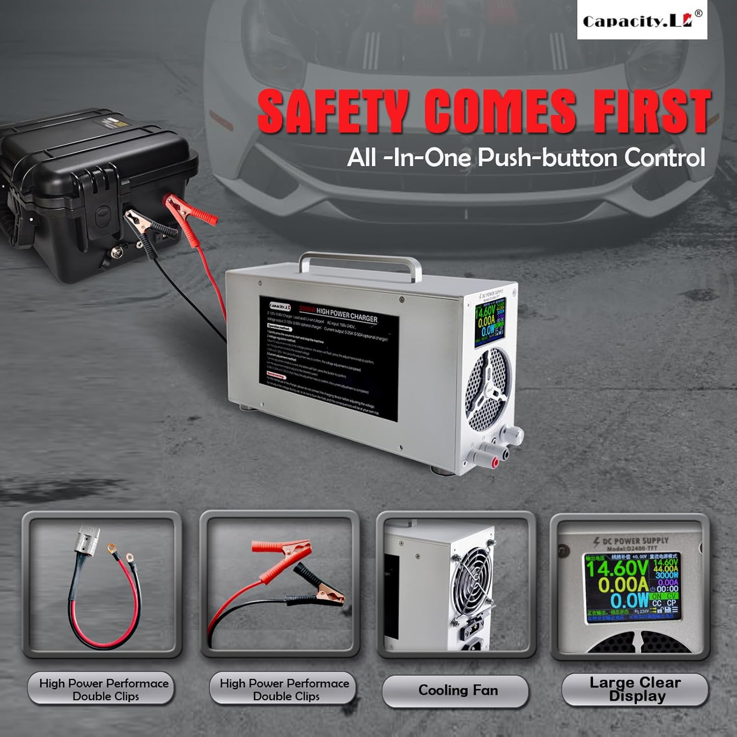 - EASY TO CONTROL & DUAL SCREEN DIGITAL DISPLAY: High power lifePO4 battery charger with adjustable voltage 0-120V & current 0-25A, Multi modes are all in one control switch, easy to control charging. Equipped with a dual screen digital display design, accurate to the last two decimal places, more precise, clear, and convenient for adjustment and viewing.