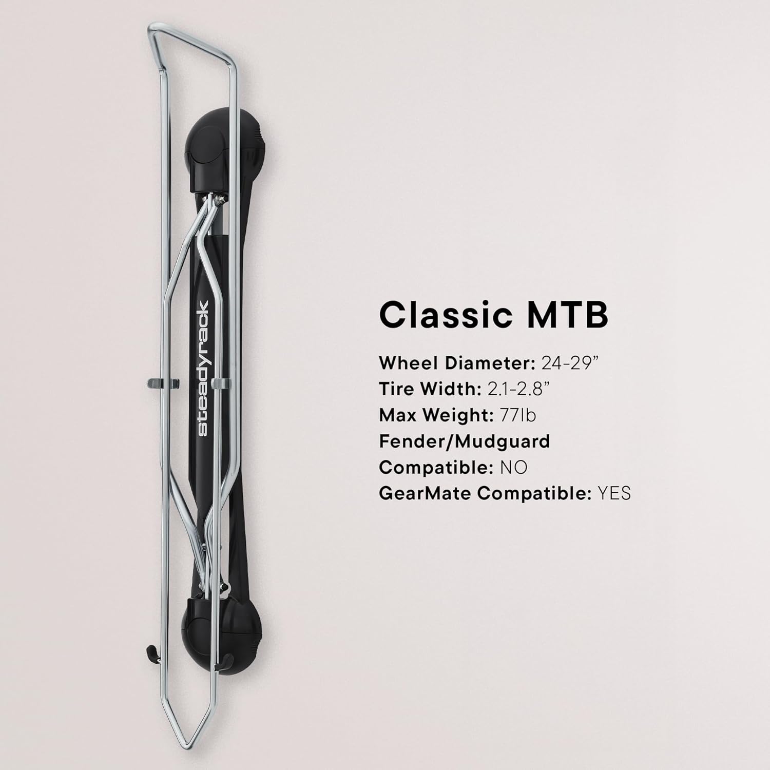 - Built for big bikes, trusted by riders β Since 2009, Steadyrack has led the way in vertical bike storage. The Classic MTB Rack is built tough for mountain and eMTB bikes, supporting up to 77 lbs with wheel sizes from 20"β29" and tires 2.1"β2.8" wide.