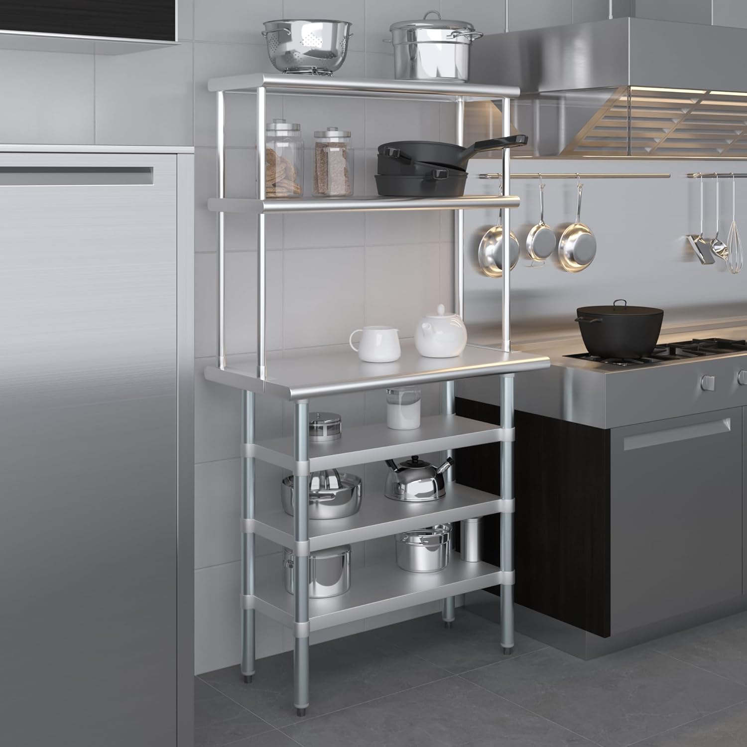 - WORK SAFETY: Work table top and double tier adjustable shelves are constructed from 18-gauge stainless steel, making this restaurant prep and serve table and double tier shelf combo set is durable and long lasting. The table top comes with a galvanized under-shelf for additional storage and adjustable legs for convenience. This table and shelf set is specifically designed and finished for use in a commercial or industrial setting, but is just as reliable in the home.