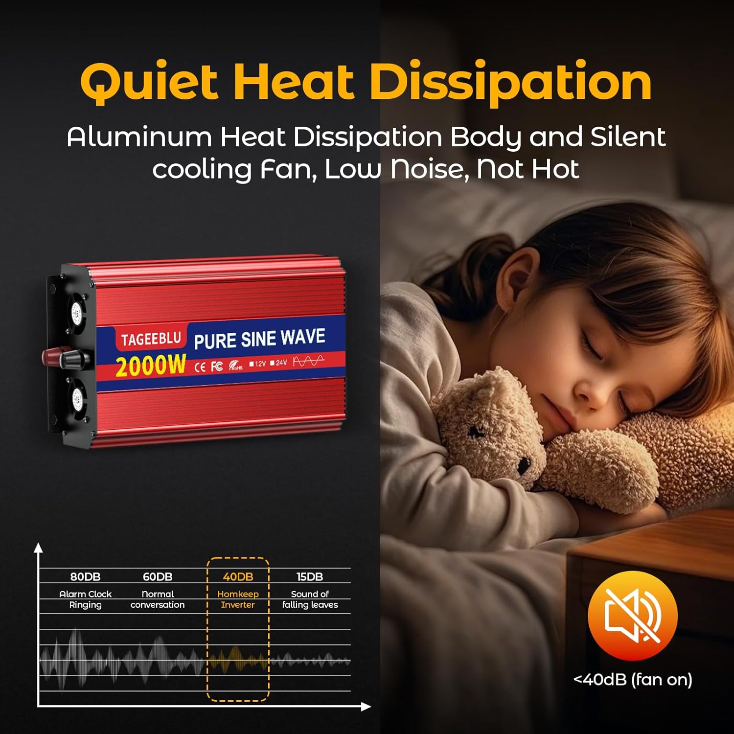 - 【Pure Sine Wave Inverter】The power inverter output waveform is consistent with the AC waveform of the utility grid and is suitable for inductive and capacitive loads. It extends the service life of the equipment and reduces the fault rate. Can be used with electrical equipment such as televisions, home theaters, car stereos and other sensitive loads for a long time.Operating noise is less than 45 dB, ensuring a quiet environment