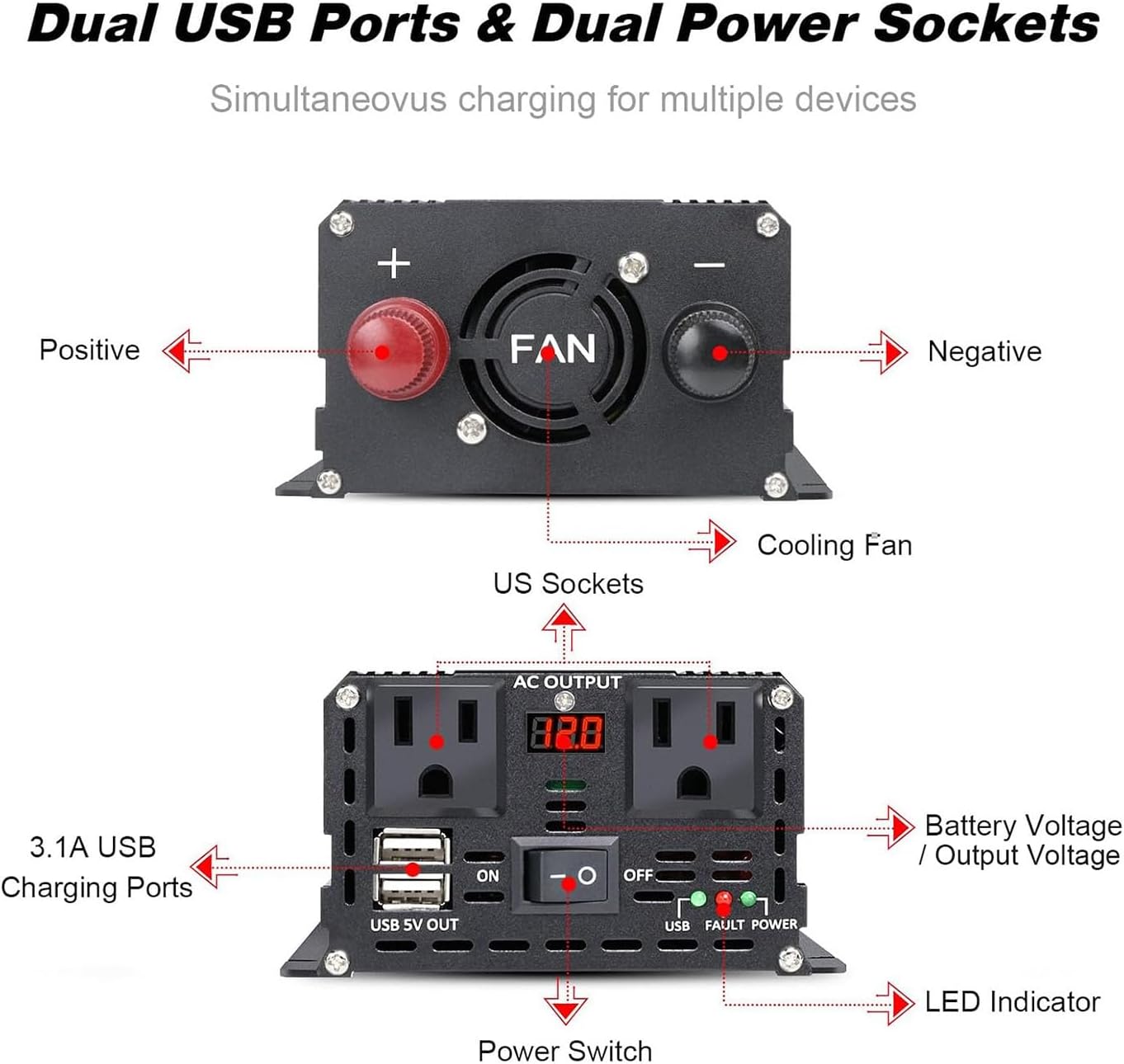- HIGH QUALITY PURE SINE WAVE OUTPUT: LVYUAN Power Inverter provides continuous and stable 1000W pure sine wave power, 2000W peak power with 2 AC outlets, 2 USB ports, easy to power multiple devices at the same time