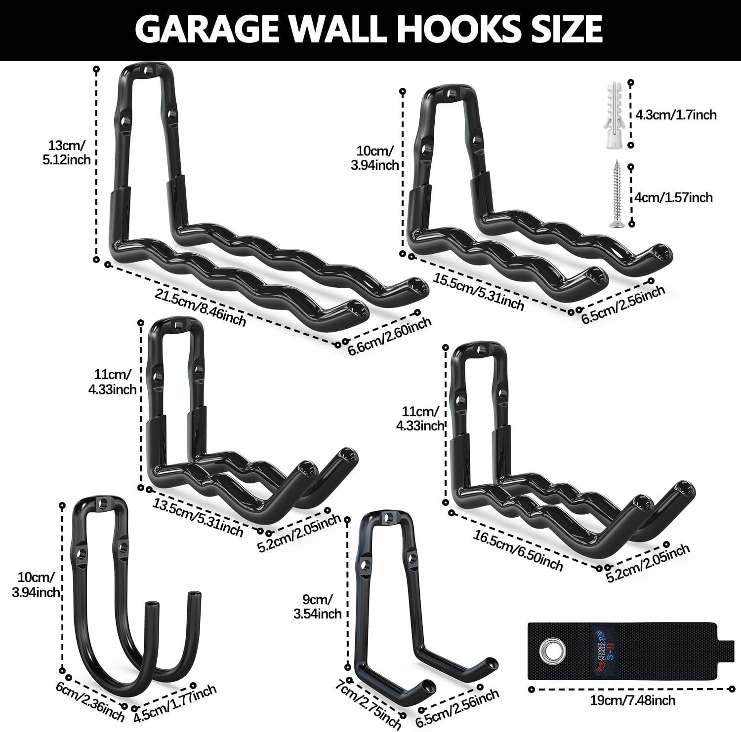 - Various Sizes Garage Wall Hooks: 14 pack tool hangers for garage wall in 6 different sizes, including 2 large wave hooks, 2 medium wave shed hooks, 2 small square hooks, 2 wave large J type garage hangers, 2 wave medium J type shovel holder wall mount, 2 small j ladder hooks for garage wall and 2 storage straps. These storage hooks for hanging in garage come with steel nails and expansion pipes for easy installation, offering a solution for enhancing your garage storage system