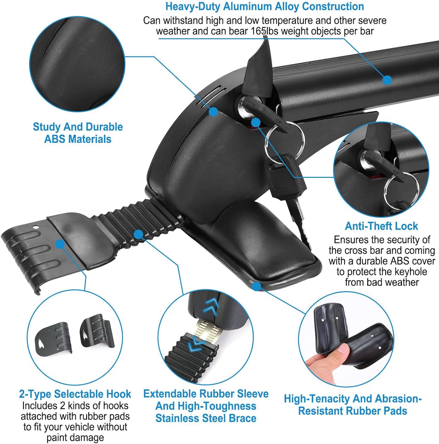 - CONSIDERATE ANTI-THEFT LOCK DESIGN: Each across bar comes with an anti-theft lock to ensure the security of the cross bar and coming with a durable ABS cover to protect the keyhole from bad weather.