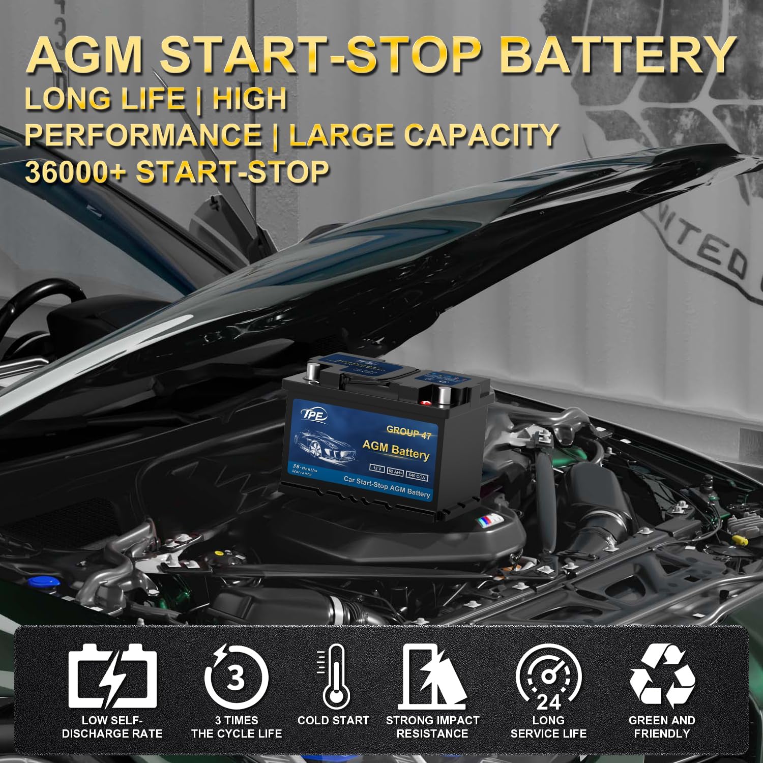 TPE AGM Battery BCI Group 47, Maintenance Free 12V 62Ah, H5 Size, 100RC, 640CCA, Automotive Battery, Reliable Performance for Cars Lead-Acid