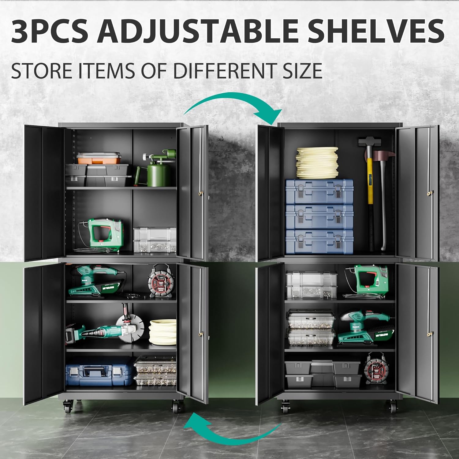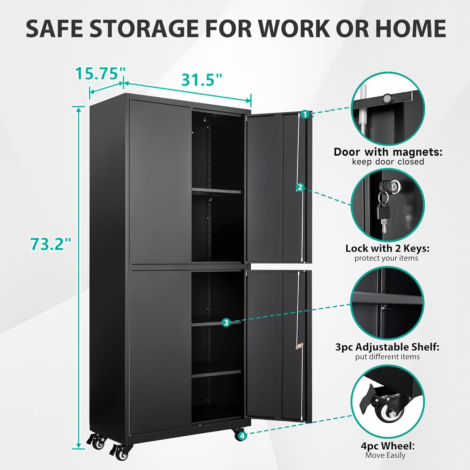 SISESOL Metal Storage Cabinet with Wheels,73" Rolling Garage Storage Cabinet with Lock,Black Metal Cabinets with Shelves and 4 Doors,Tall Tool Cabinets on Wheels for Garage,Home,Office,Shop