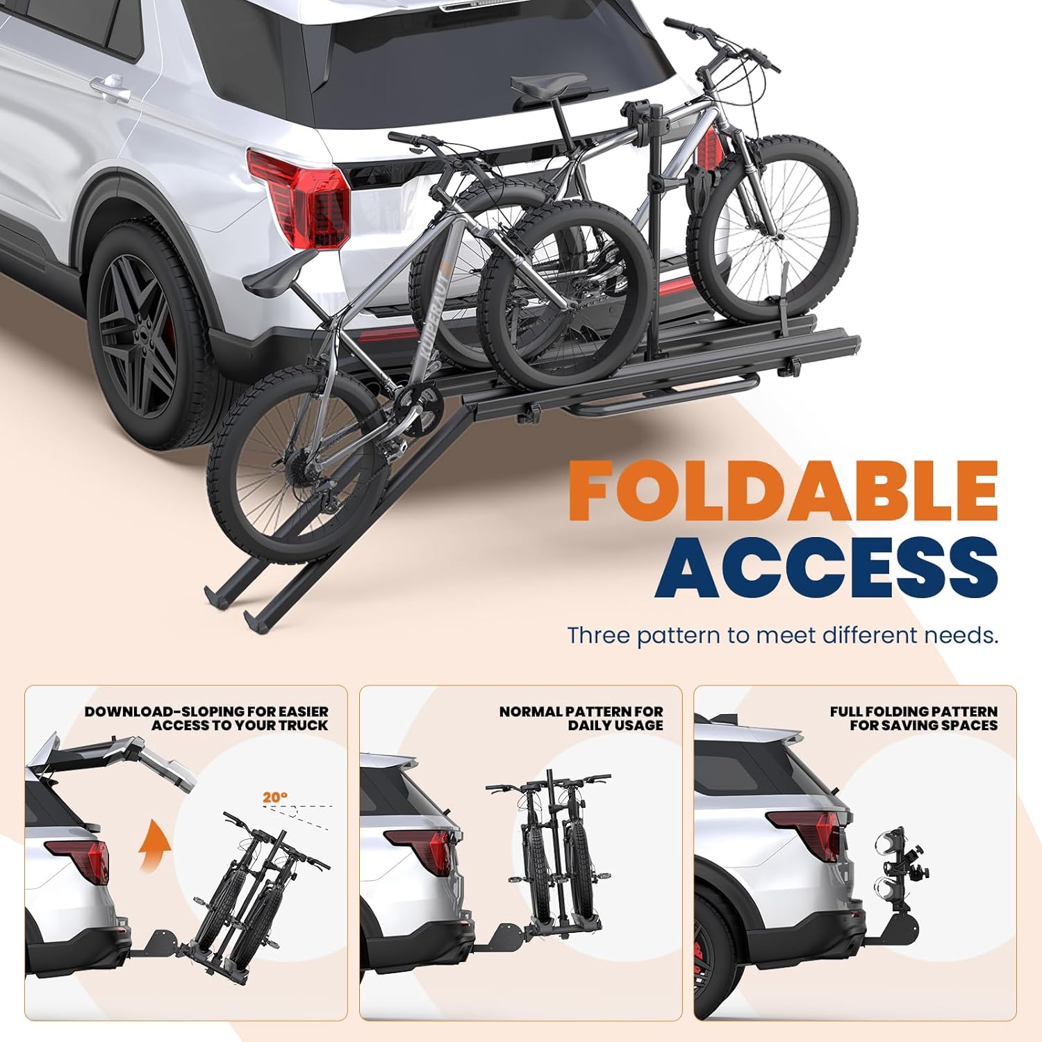 - Thoughtful Ramp Design: Aluminum 2 EBike rack compatible with 2 ramps( downward sloping design), it can be pulled in and out from tray. Sturdy hitched racks accommodate 2 bikes up to 200 lbs capacity for more easier and convenient to roll-onto