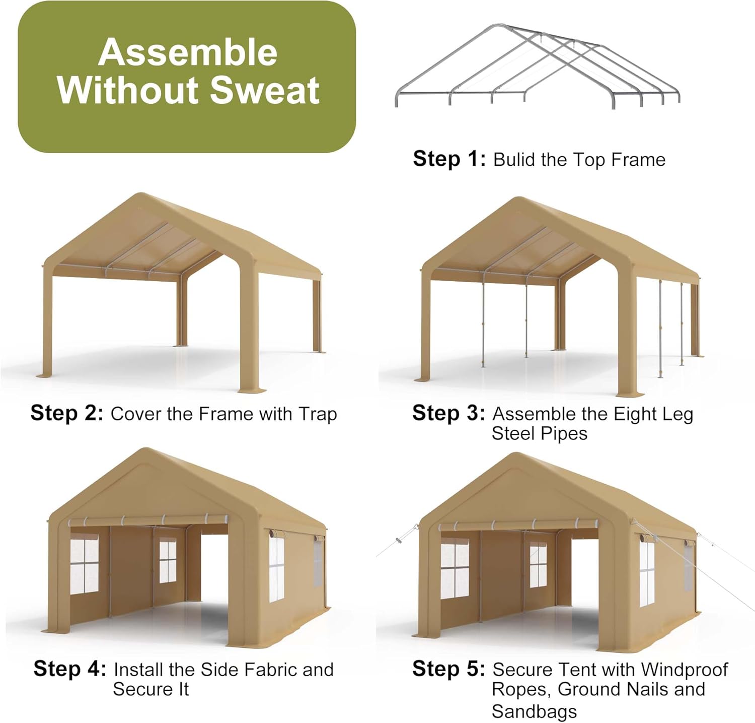 - - **Sturdy Construction**: Featuring reinforced steel poles and eight galvanized steel pipes with a double-walled structure, this Upgraded Carport ensures stability and durability. Rust-proof powder coating prevents cracking, peeling, rust, and corrosion.