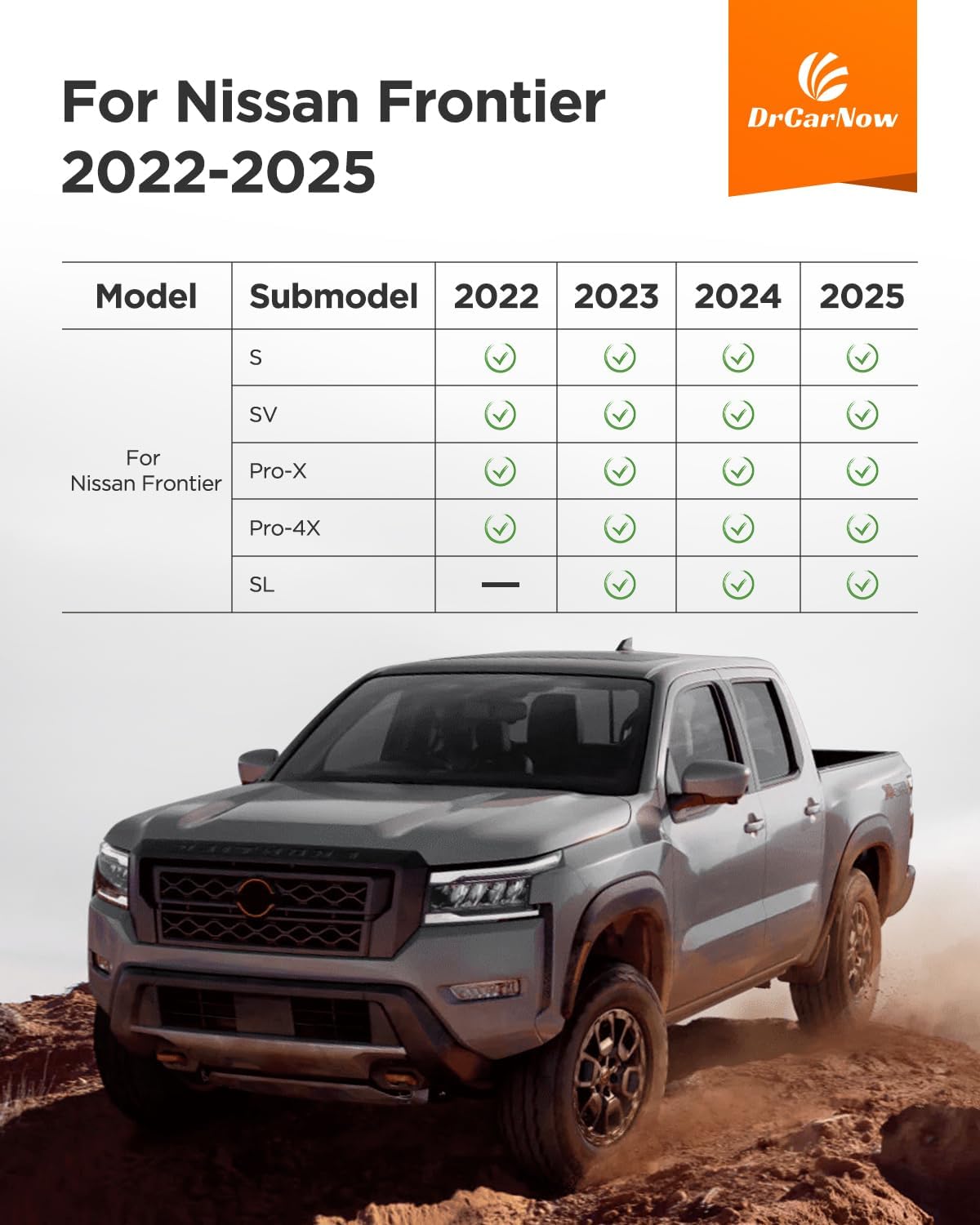 - ăFor Nissan Frontier 2022-2025ăHigh-precision laser measured for Nissan Frontier 2022-2025, providing optimal coverage and a factory look. Features a specially designed retention system and non-slip nibs to keep mats securely in place.2022 for nissan frontier floor mats, 2023 for nissan frontier floor mats, 2024 for nissan frontier floor mats, 2025 for nissan frontier floor mat, for nissan frontier floor mats, for nissan frontier floor mats