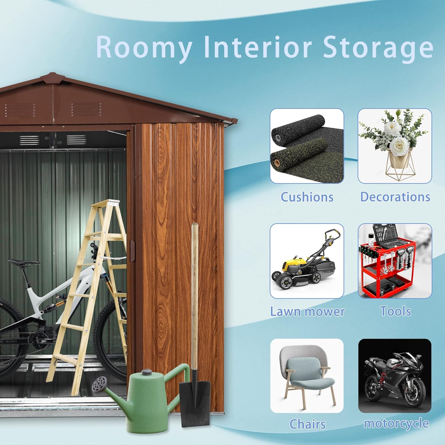 - [Robust Construction] Nothing irks a garden hobbyist more than the sight of a collapsed shed. Luckily, this shed utilizes sui generis aluminum frames which greatly increase the overall sturdiness. On top of that, the galvanized steel panels, coated with eco-friendly painting, can endure harsh weather for at least 6 years.