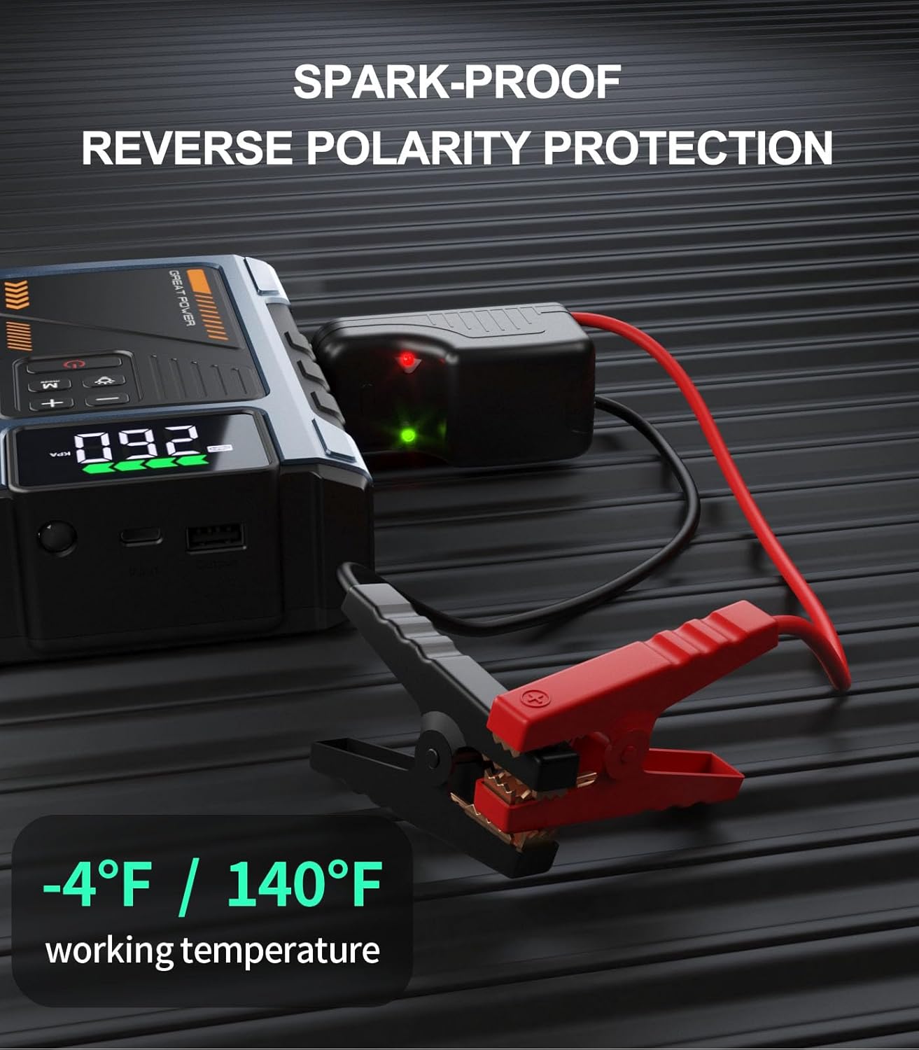 - INTELLIGENT SAFETY PROTECTION - The jump starter battery pack with 10 safety features to protect your devices that includes over-charge, over-current, short-circuit, reverse-polarity, low-temp, high-temp, over-voltage, over-load, spark-proof, reverse-charge to ensures longer service life