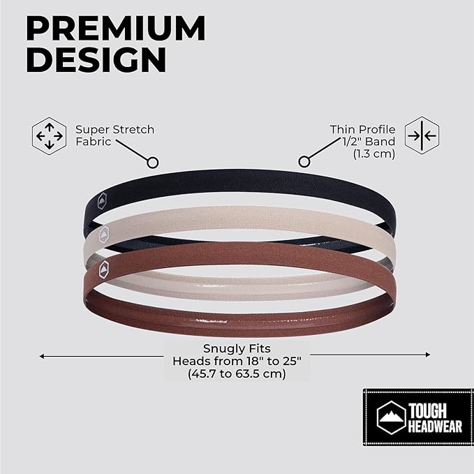 Tough Headwear Thin Elastic Headbands, Sports Headbands for Women & Men - Mens Workout Headband - Running or Soccer Headband - 3-Pack