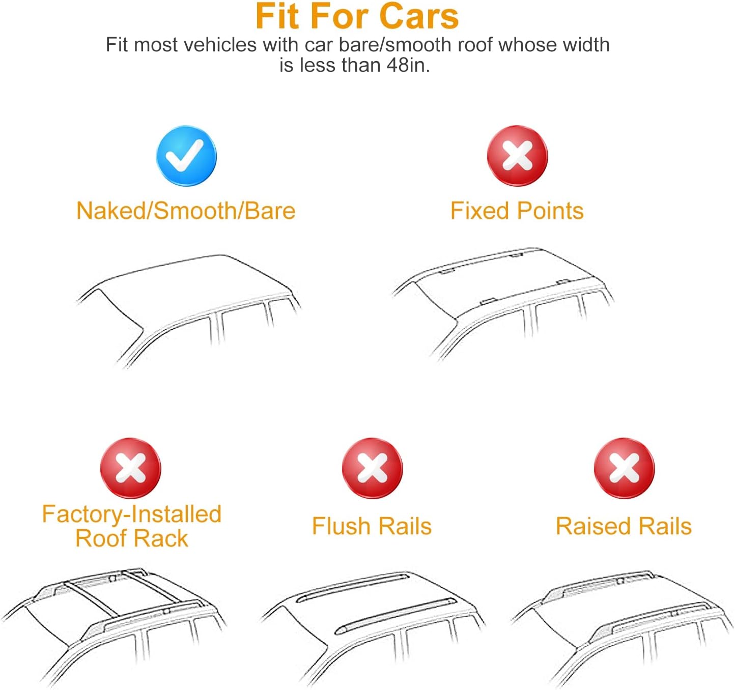 - 【Universal Fit for Most Bare Roofs】This universal roof rack is universal fit for vehicles with bare/smooth roofs, width less than 48 inches. Not compatible with vehicles featuring raised rails, flush rails, fixed points, or factory-installed roof racks. Please verify compatibility with your vehicle before purchasing.