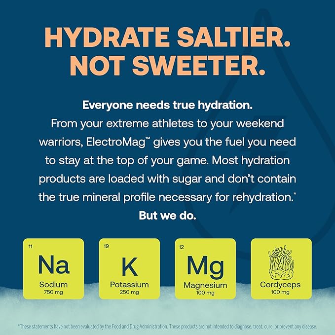 - TRUE DIFFERENCE - ElectroMag is crafted with intention using carefully sourced ingredients. Contains 750 mg sodium, 1390 mg chloride, 250 mg potassium & 100 mg magnesium for essential minerals; 100 mg fruiting body cordyceps mushroom for endurance.
