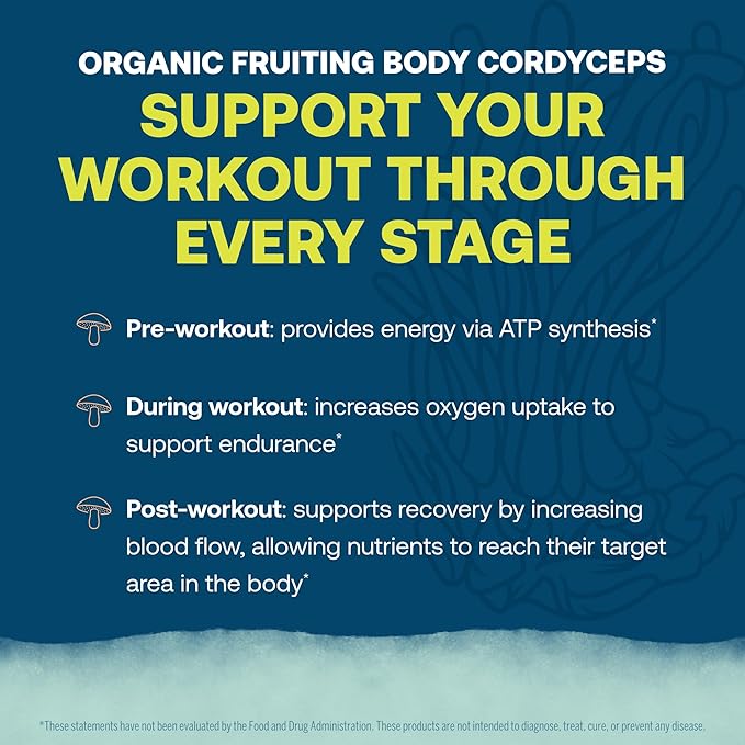 - KEY INGREDIENTS - Organic fruiting body cordyceps mushroom have been used for energy production, oxygen utilization, and muscle recovery. Studies show Cordyceps may improve the way the body uses oxygen, especially during exercise.