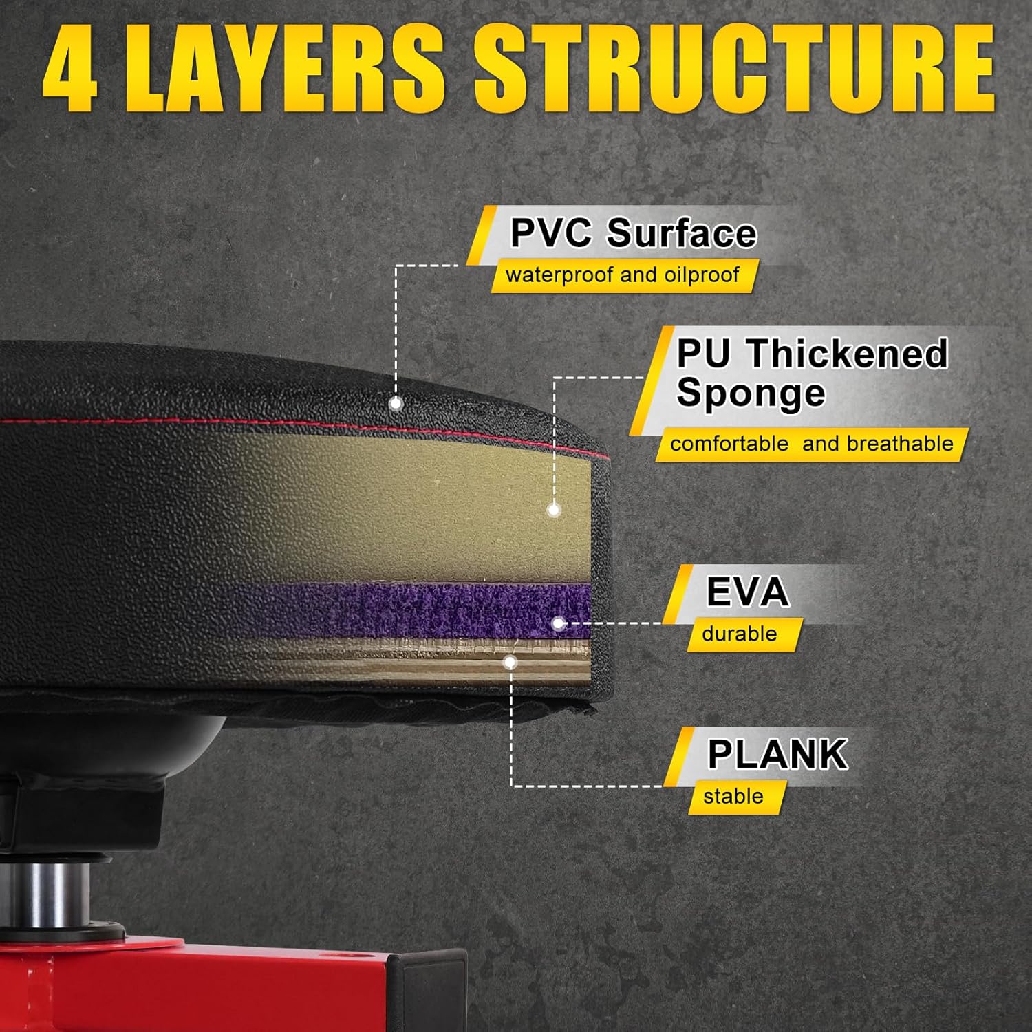- 【4 layers Structure】The mechanic chair's thick cushion is 3.74"/9.5cm height and consists of FOUR layers structure. The first layer is a solid wooden plank, the second layer is a durable EVA, the third layer is a comfortable and breathable PU thickened sponge, and the fourth layer is a waterproof and oilproof PVC surface. Soft, Firm, and Comfortable. Make it easy to be cleaned