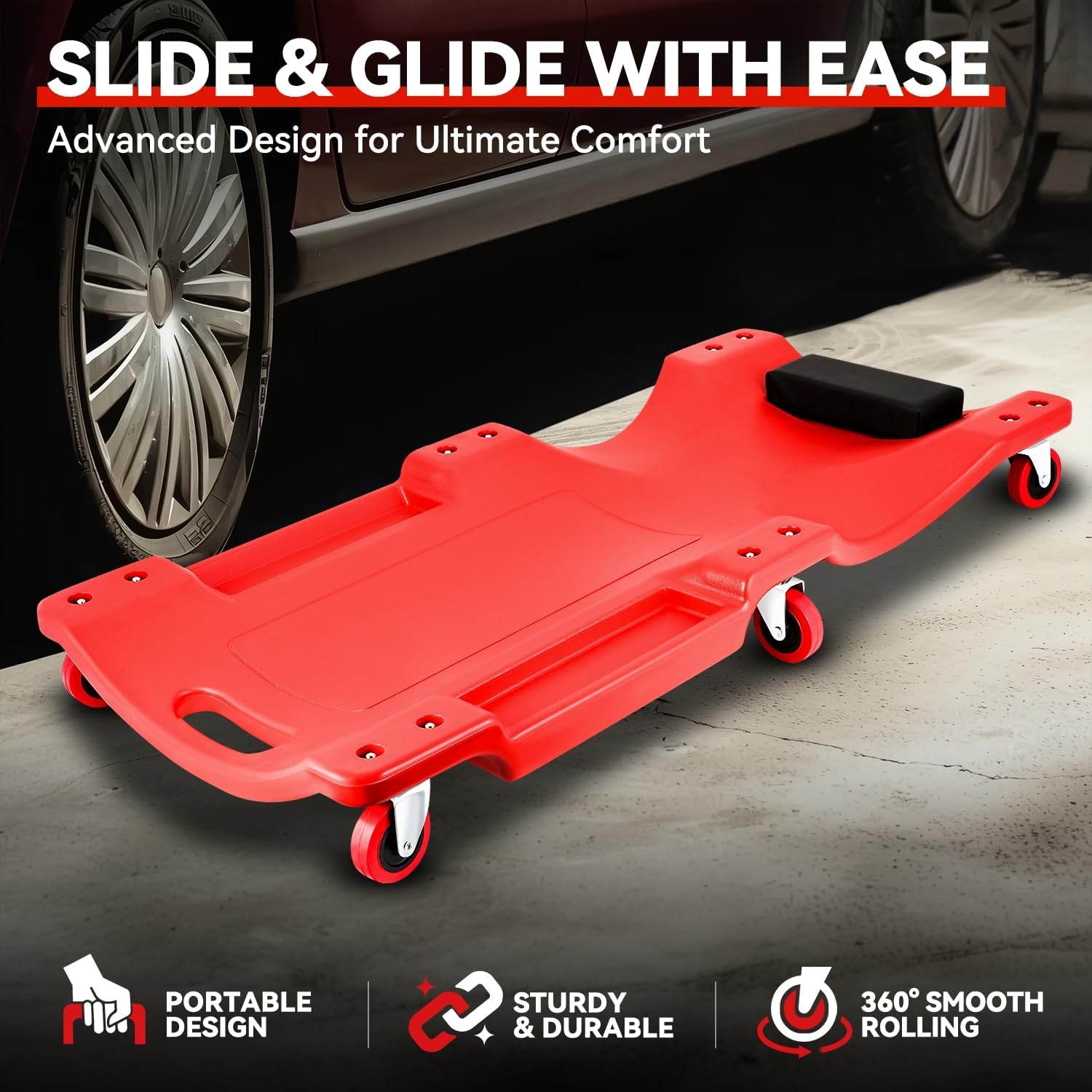 Auto Dynasty 36 Inches Mechanic Creeper, Automotive Garage Repair Low Profile Under Car Rolling Creeper with Padded Headrest, Plastic, Red