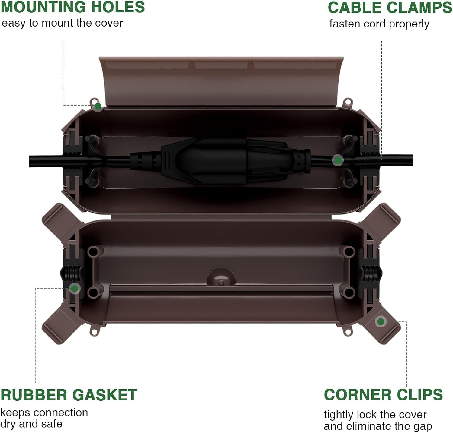 - Easy to use, place the connection into the safety seal enclosure and clip the cord with the clamps. To hang the cover, use the included cable ties and insert them to the side mounting holes. And this color can blend with your deck very well.