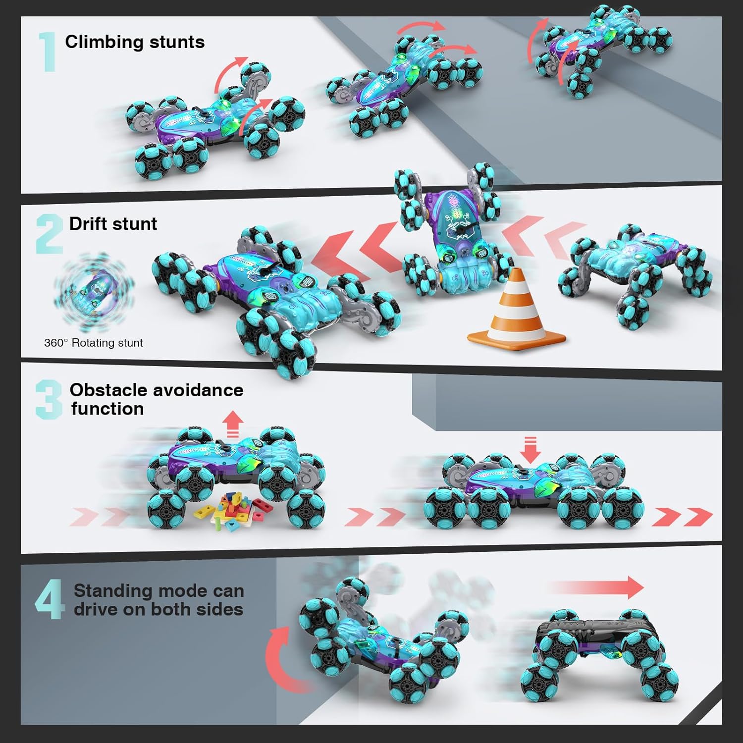 - 8WD Gesture Sensing RC Car: Experience awesome stunt with Paaxido 8WD RC car, 360Β° rotation, circle, drift, crawl, and double-sided driving, equipped with 4 pairs of swinging arms which allows elude the obstacle and climb stairs with ease