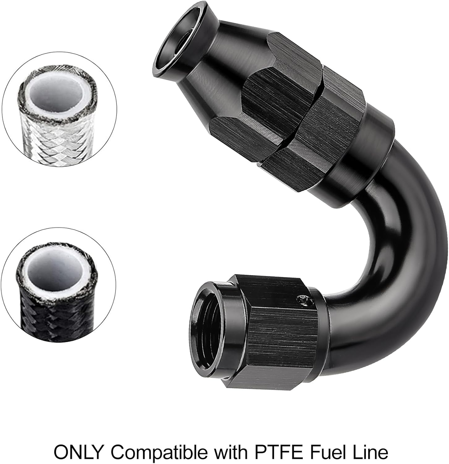 - [Application] These fittings are ONLY used with PTFE fuel lines for E85, alcohol, nitro, clutch, nitrous, power steering, oiling, hydraulics, and vacuum applications. A 360° swivel design allows for easy assembly.