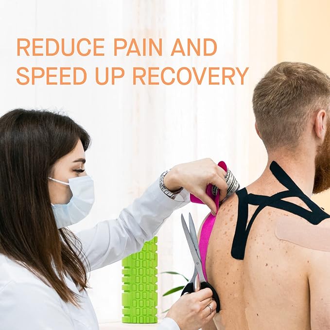 - SKIN FRIENDLY AND LATEX FREE - OK TAPERegular Kinesiology Tape is made of high quality hypoallergenic material and is skin friendly. The professional acrylic glue sticks well and is latex-free to minimize the possibility of skin irritation, itching and blisters.