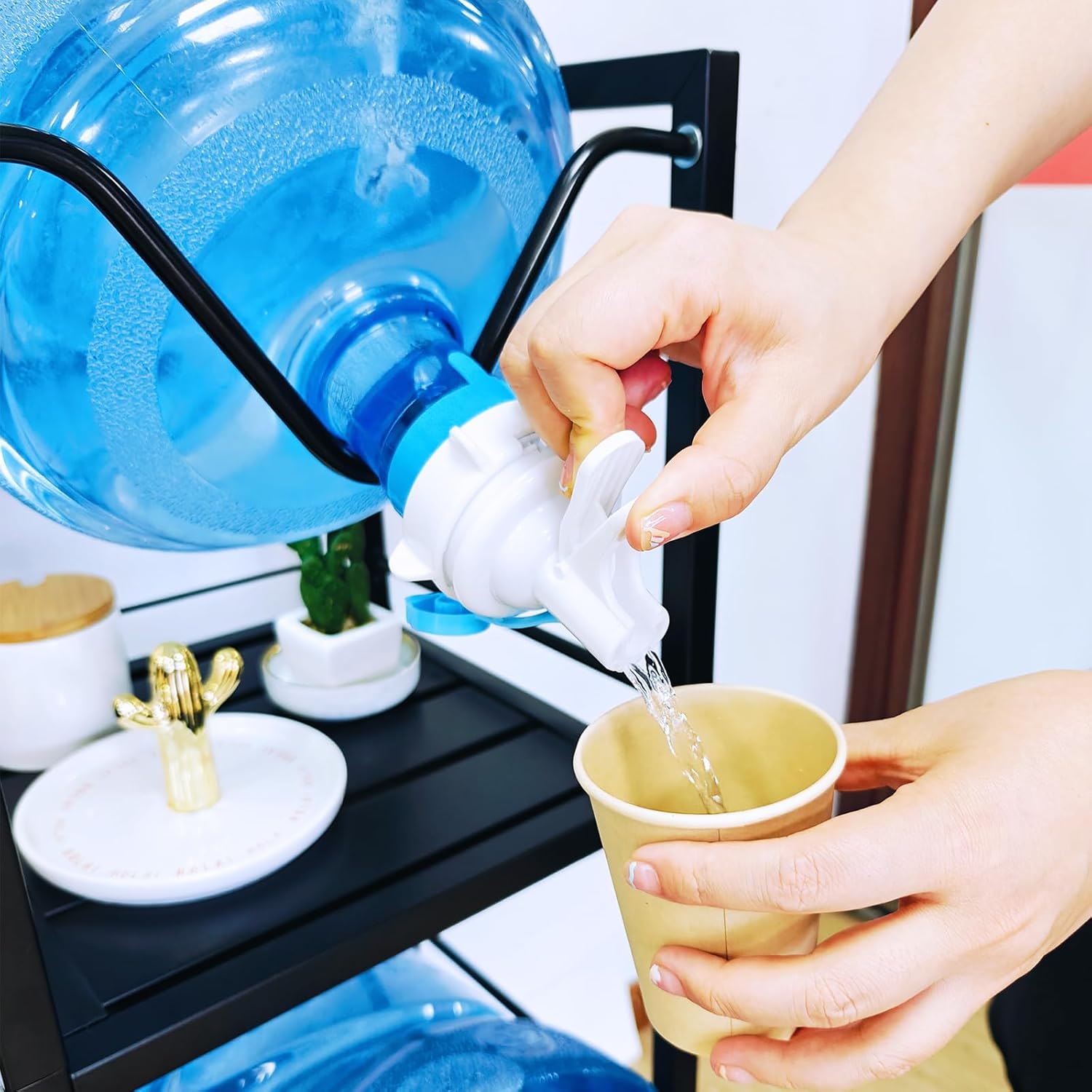 - WITH STORAGE SHELVE: The 5 gallon water bottle storage rack has an 11.8" L metal plate to hold water bottles, coffee mugs, potted plants, vases or toys. Turn a boring water shelf into cozy home decor.