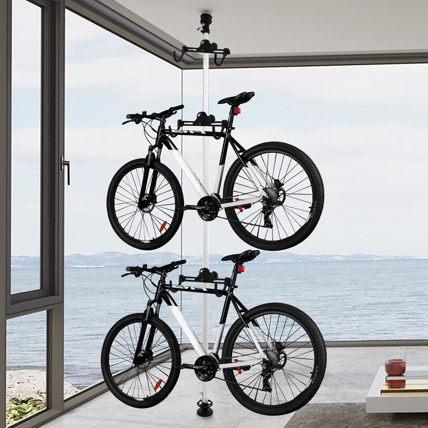 - High Stability: High hardness aluminum alloy main tube, thickened tube diameters (1.77 inches, 1.57 inches, 1.38 inches), booster spring top base, and booster fastening knob make this product strong and sturdy, and each hook can hold up to 66.14 lbs, ensuring that the bikes on display are safe and secure. Screw holes in the base under the booster fastening knob allow you to double-fasten the hooks to further enhance stability.