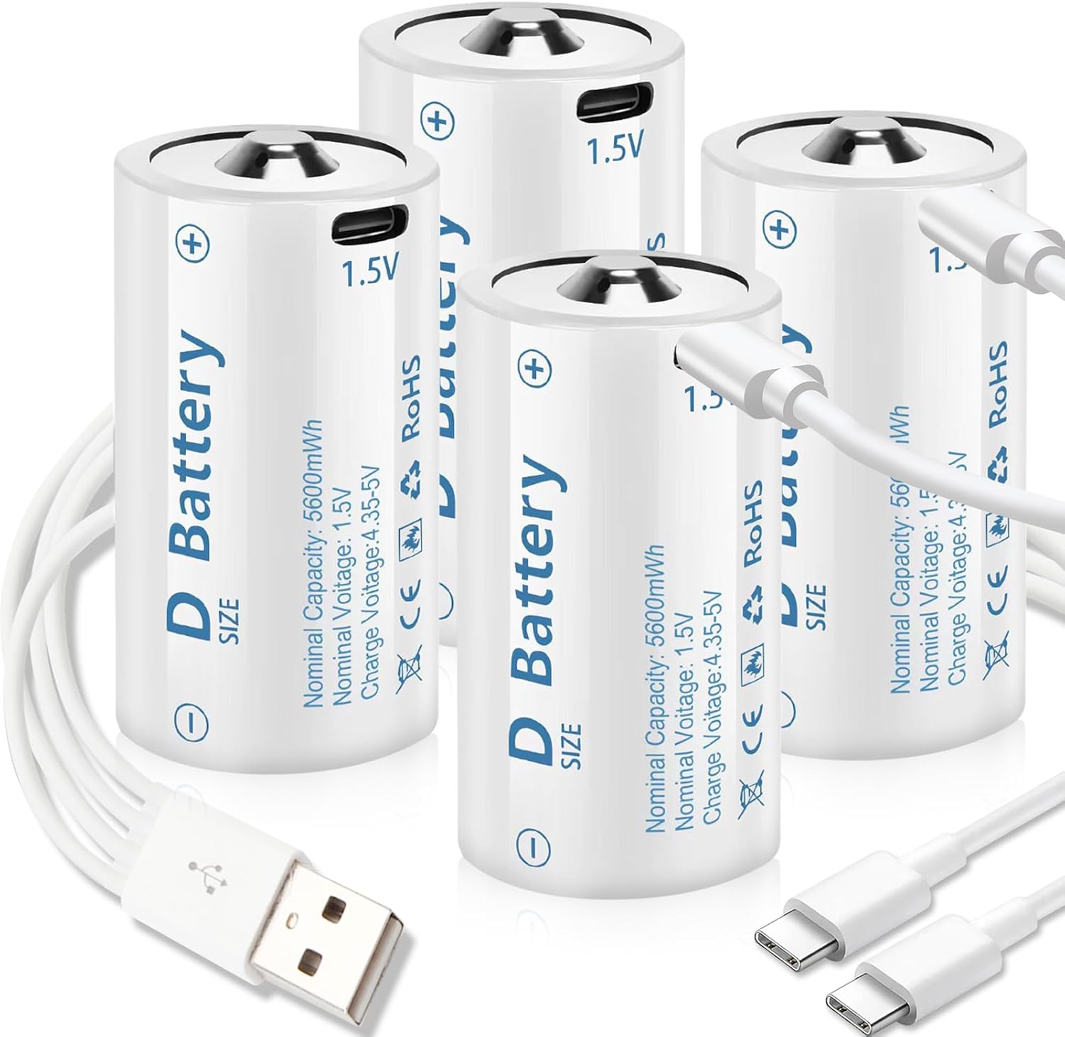 D Cell Batteries 4 Pack,Lithium D Batteries 5600mWh, Rechargeable D Batteries with USB-C 4 in 1 Charging Cable, 1.5V D Cell Battery for Flashlight Toys & floodlight