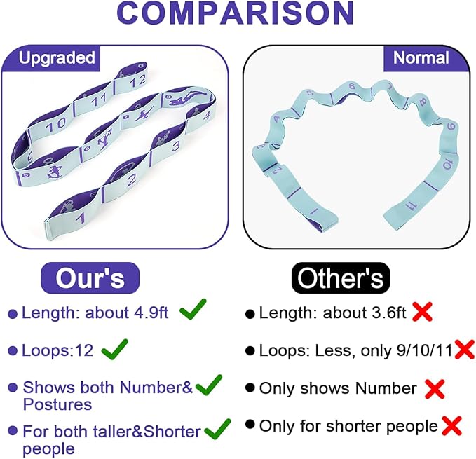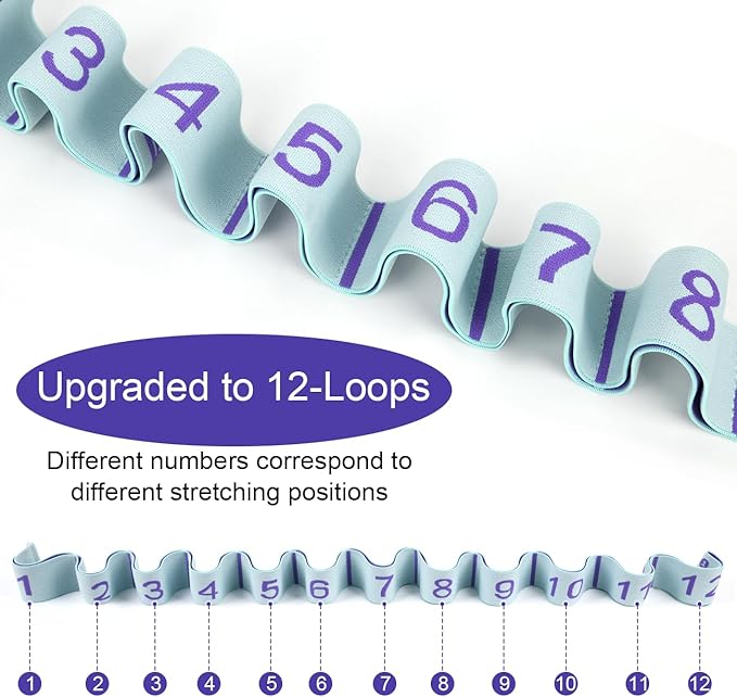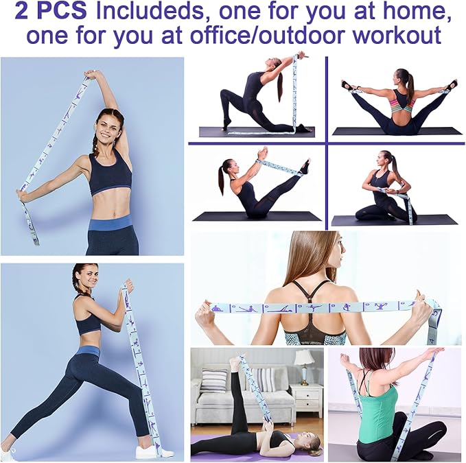 - ❖【2PCS Stretching Straps with Extra Long 12 Loops Design】 This stretch band has been UPGRADED. We lengthened the size and embroidered with a variety of yoga poses for user's reference. You don't have to worry about getting a size that's too short anymore!