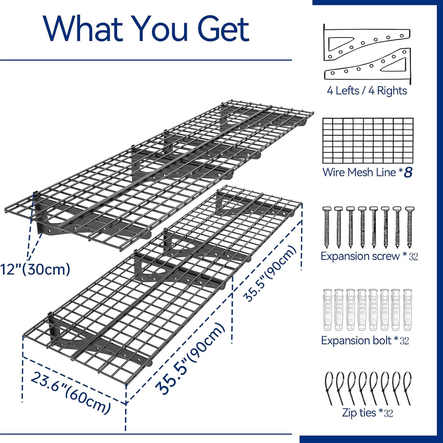 - 2pack wall frame includes accessories: 8support brackets; 8 mesh brackets; 32 expansion bolts; 32 expansion screws; 32 buckles; 1 horizontal mounting template(We will manually check before shipment, if there are any missing immediately contact us!)