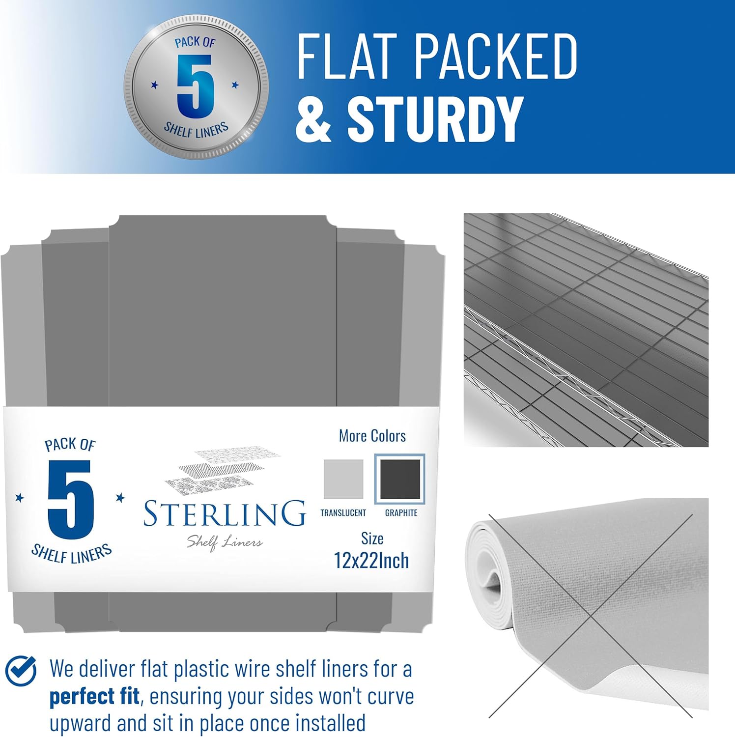 - Flat Packed & Sturdy: We deliver perfectly flat packaged plastic wire shelf liners to ensure your sides won't curve upward and they sit perfectly flat once installed.