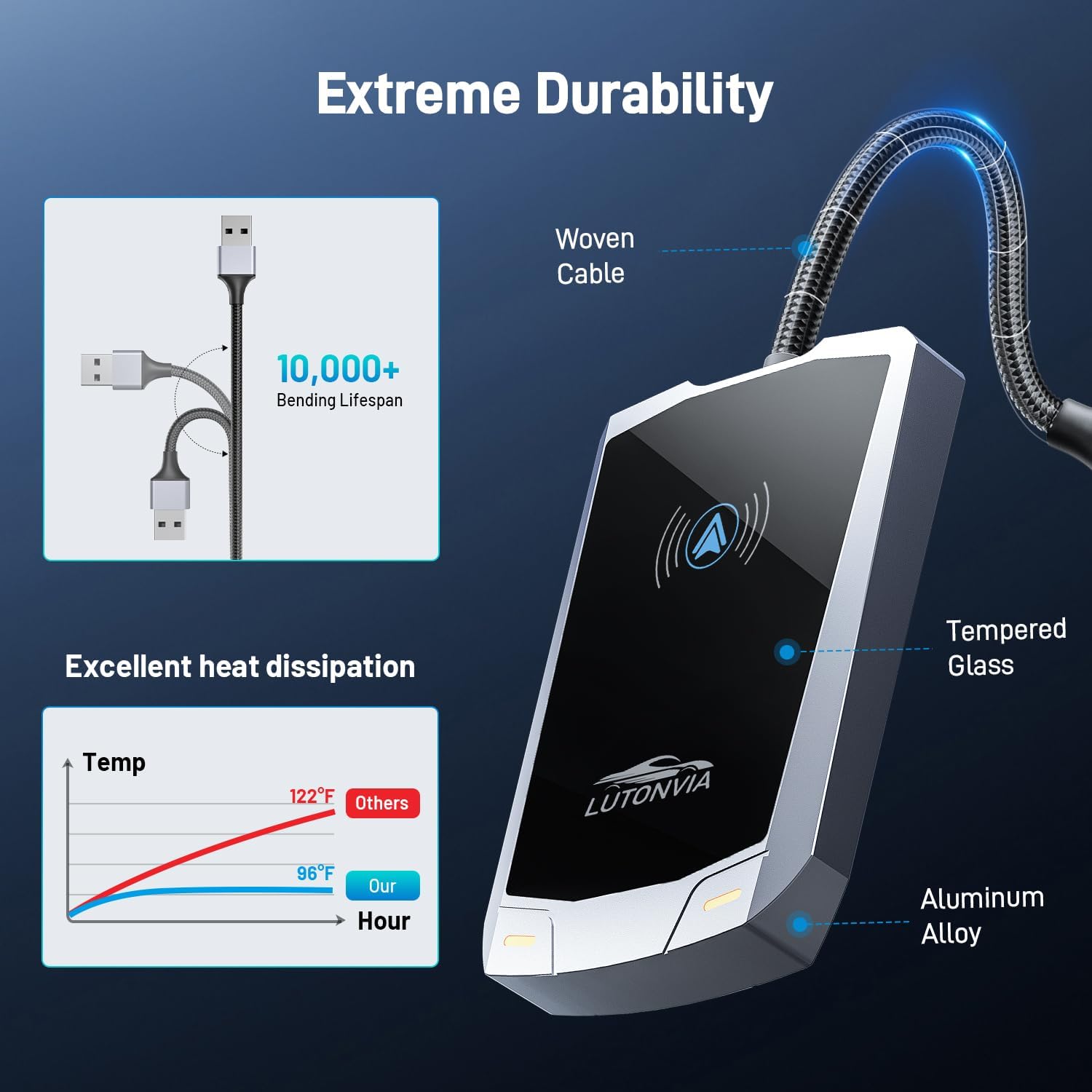 - 【Premium and Durable】Lightweight aluminum alloy and tempered glass ensure durability and longevity. Our cables and metal boxes have withstood 100,000+ tests, lasting 3× longer than the plastic receivers. Also, the special material car adapter enhances heat dissipation, and keeps excellent performance in Anti-Oxidant, hardness, corrosion, and Temperature tests (-4°F to 140°F).