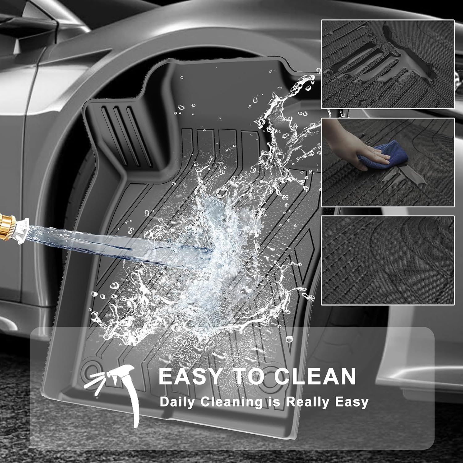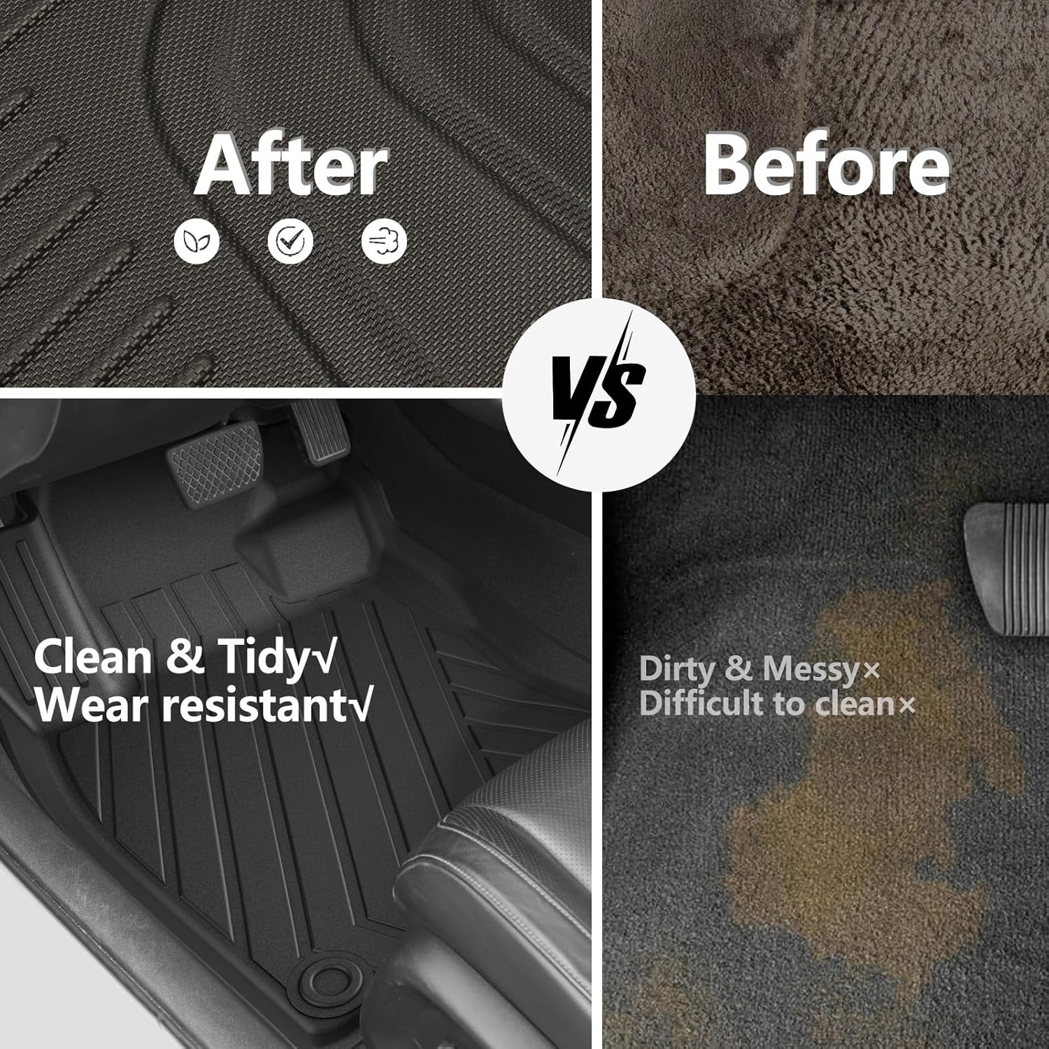 - ăAll Weather Protectionă Full set car floor liners designed with high hemming to better protect car carpets, against dust, mud, salt, rain, snow, and sand, achieving all-weather protection, easy to clean and you no longer have to worry about bad weather damaging the car floors