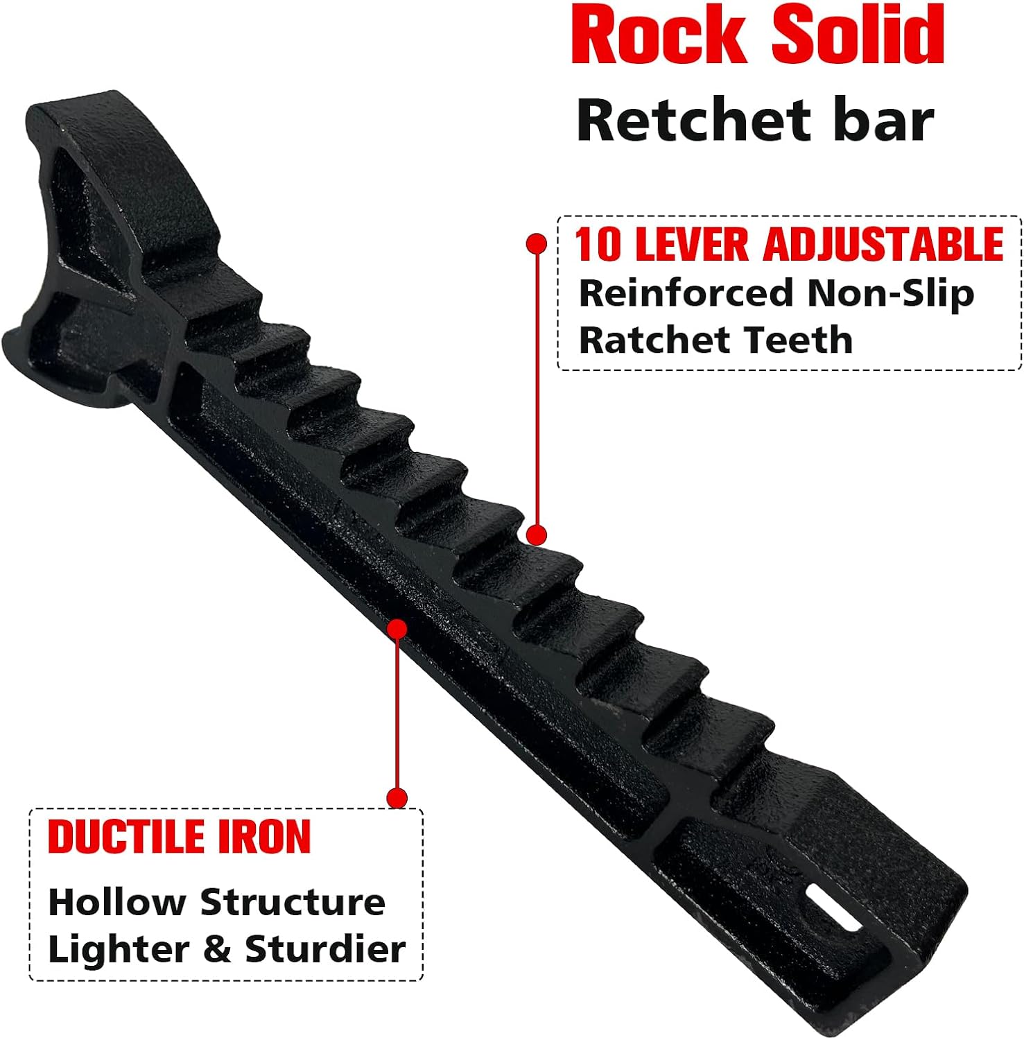 - 【Adjustable Ratchet Bar】: The multi-position ratchet bar is made of high-quality cast ductile iron, thickened and forged in one piece, which is durable and not easy to break. The ratchet bar adopts a serrated design, which can be easily and quickly adjusted to the required height and locked in place, allowing DYI enthusiasts or mechanics to maintain or repair cars safely and happily