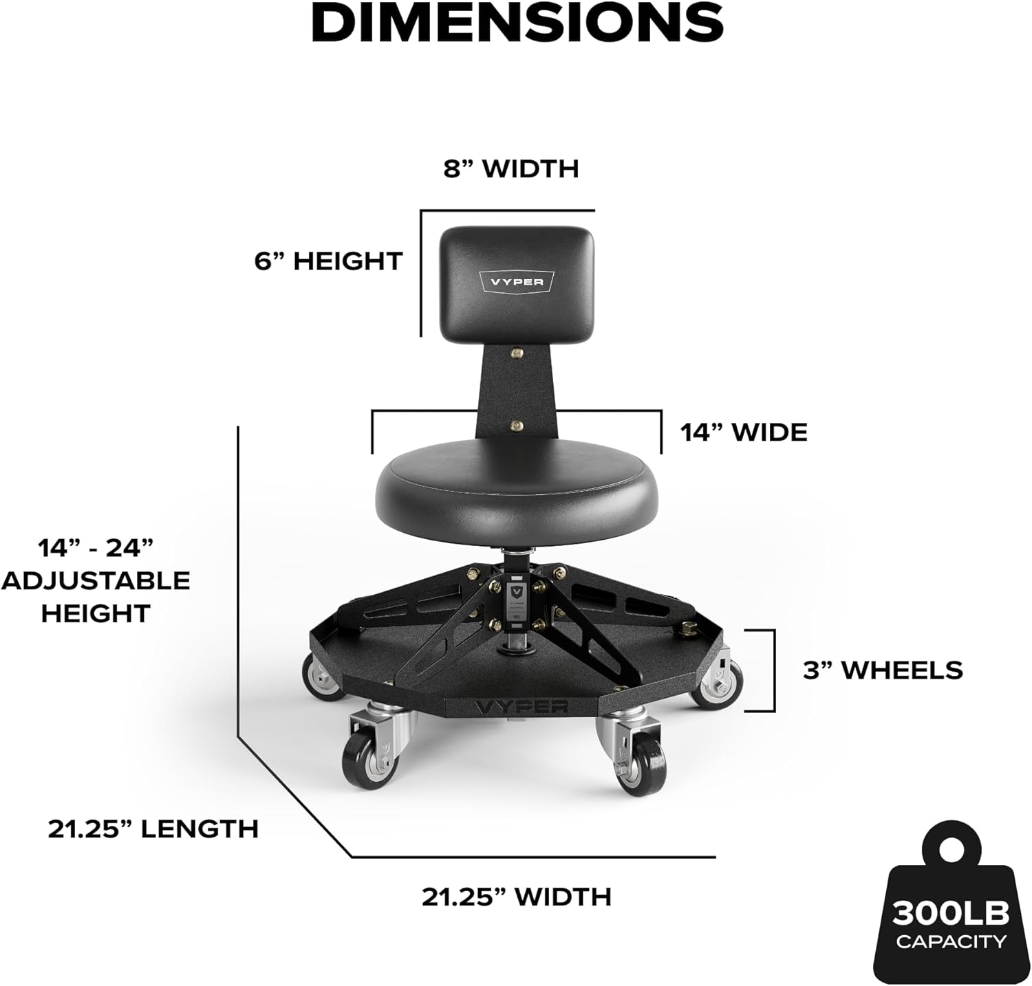 - Hassle-free mobility – With a 300 lb weight capacity, robust steel frame, and large 3" industrial-grade casters, this shop stool effortlessly glides over various surfaces and prevents tipping.
