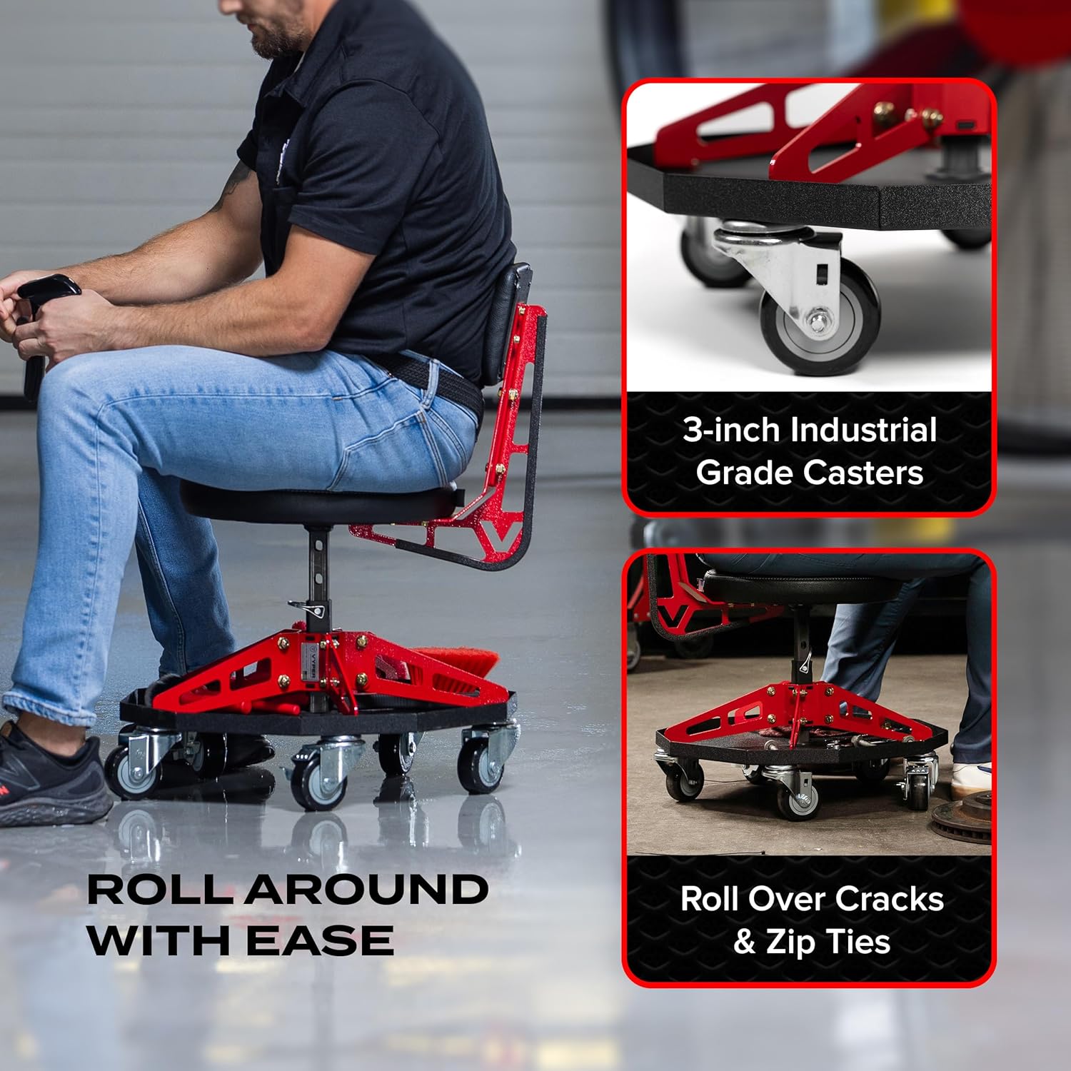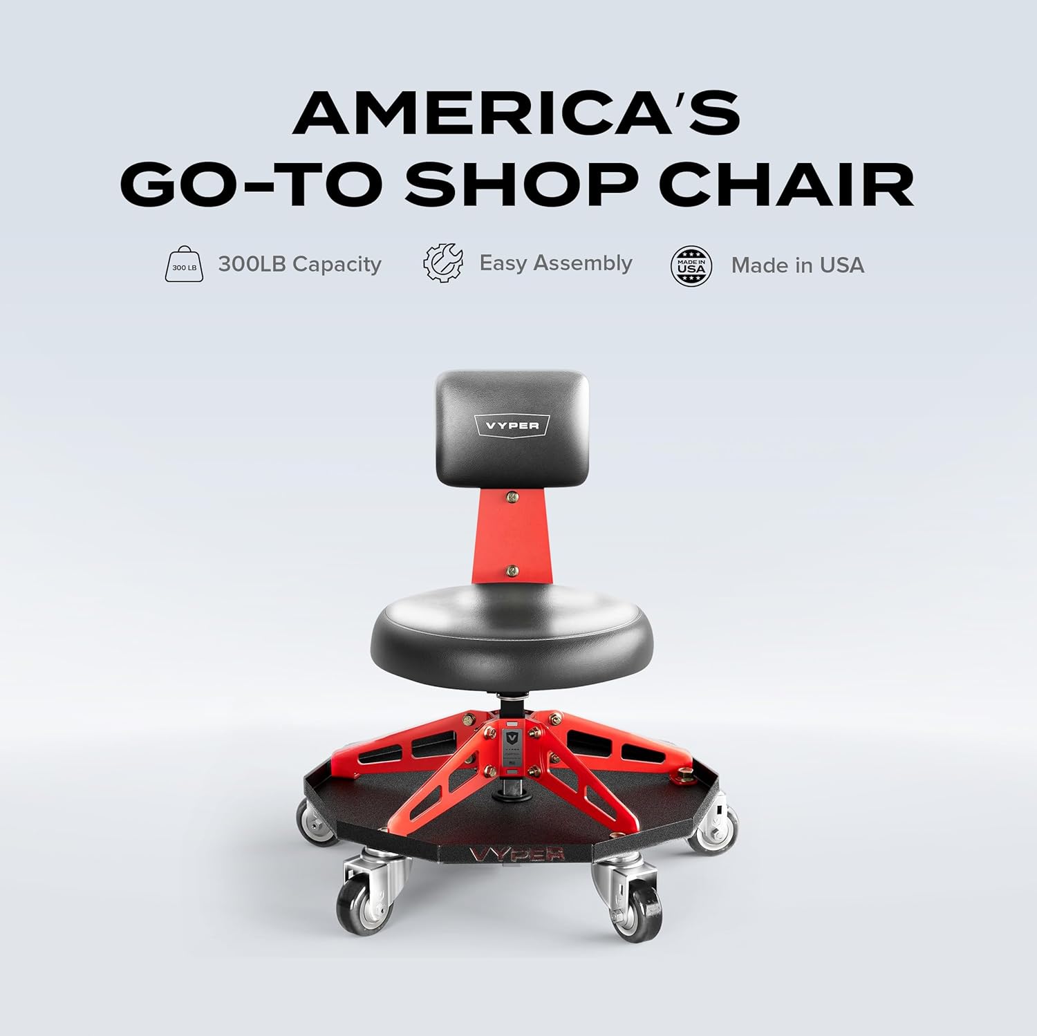 Vyper Robust Steel Sport Shop Chair for Mechanics, Automotive, DIY - 300 lb Capacity Garage Stool with Backrest & Large Wheels (Black Seat, Red Frame)