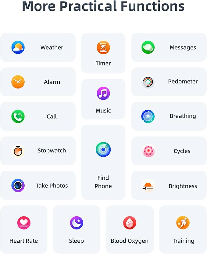 - 【24/7 HEALTH COMPANION FOR COMPREHENSIVE PROTECTION】This fitness watch is your all-day health companion! Featuring 24/7 heart rate monitoring, sleep tracking, manual blood oxygen monitoring, and menstrual cycle tracking for women. Access real-time data through the app and enjoy sedentary alerts, hydration reminders, and breathing exercises to boost your well-being. Choose this health monitor watch to elevate your health journey and enjoy peace of mind!