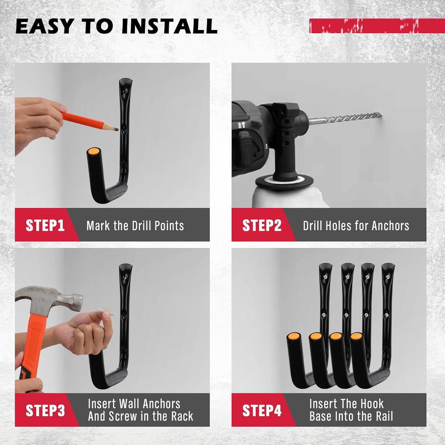 • STURDY CONSTRUCTION – Built from high-quality low-carbon steel, these heavy-duty garage wall hooks feature a rust-resistant powder-coated finish. They support up to 100lbs and include EVA arm protectors to prevent damage to your gear