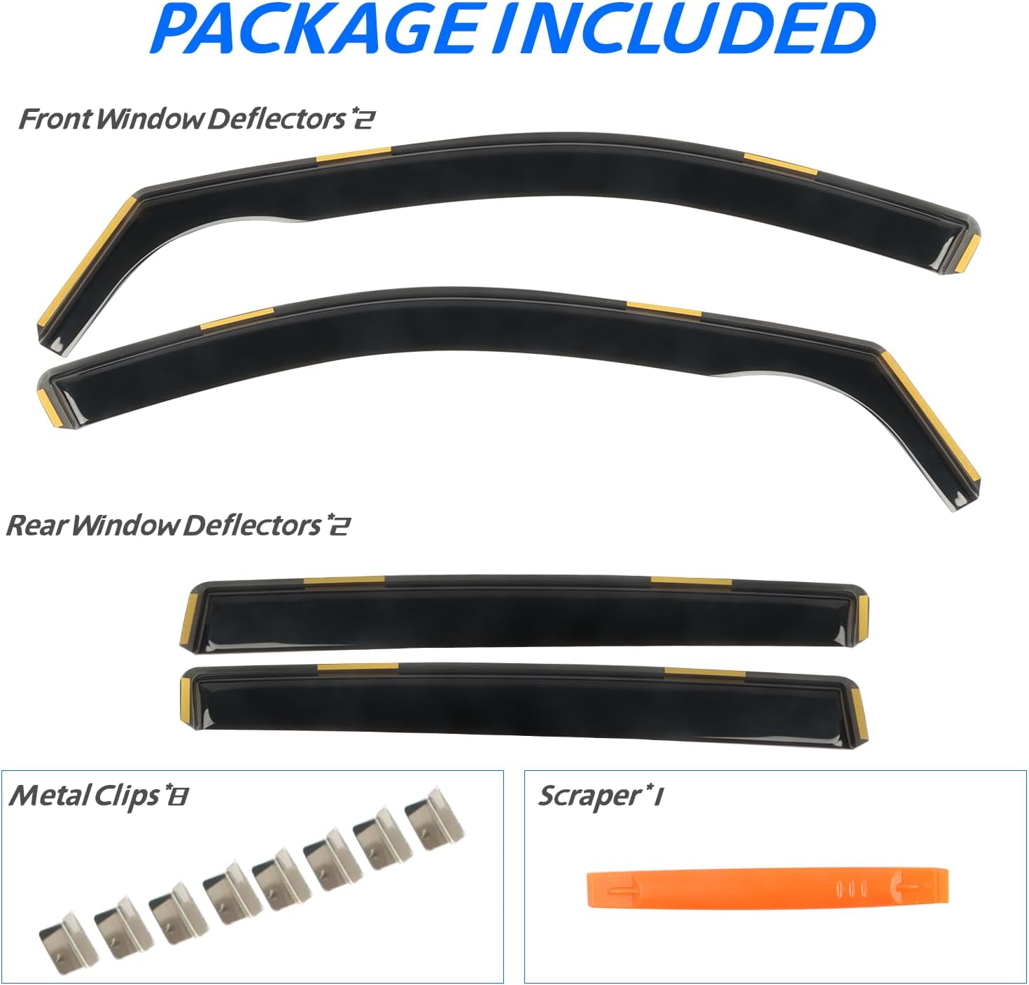 - DURABLE MATERIAL: Vent window deflectors made from high-quality and durable anti-shatter material thatโs scratch resistant, will not be easy to crack, break, or chip. Created specifically for your vehicle's make and model to ensure sleek and streamlined appearance