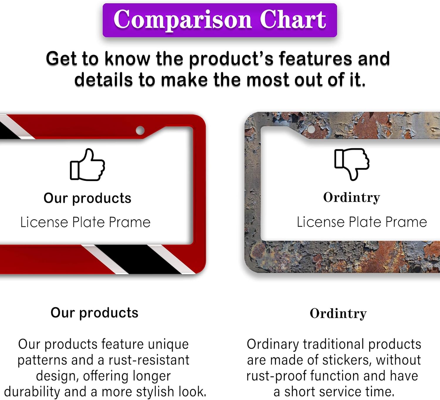- ALUMINUM FRAME: This License Plate Frame is crafted from high-quality aluminum that is resistant to corrosion, rust, and harsh weather conditions. Its rugged reliability design ensures a long lifespan, making it capable of withstanding car washes and extreme weather, providing you with a reliable and stylish solution for your vehicle.