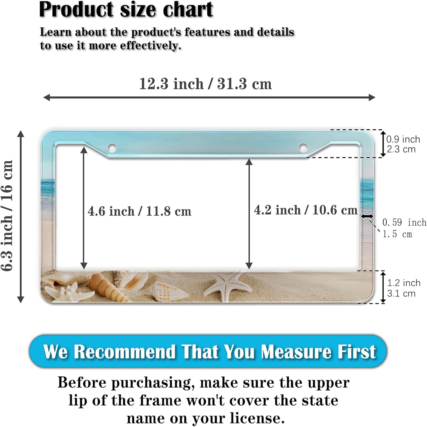 - STANDARD FRAME SIZE: Ensure a perfect fit by checking the dimensions to avoid covering your state name. These frames are specifically designed to fit standard American license plates measuring approximately 12.3" x 6.3" (16 x 31 cm). for most license plates in the U.S.