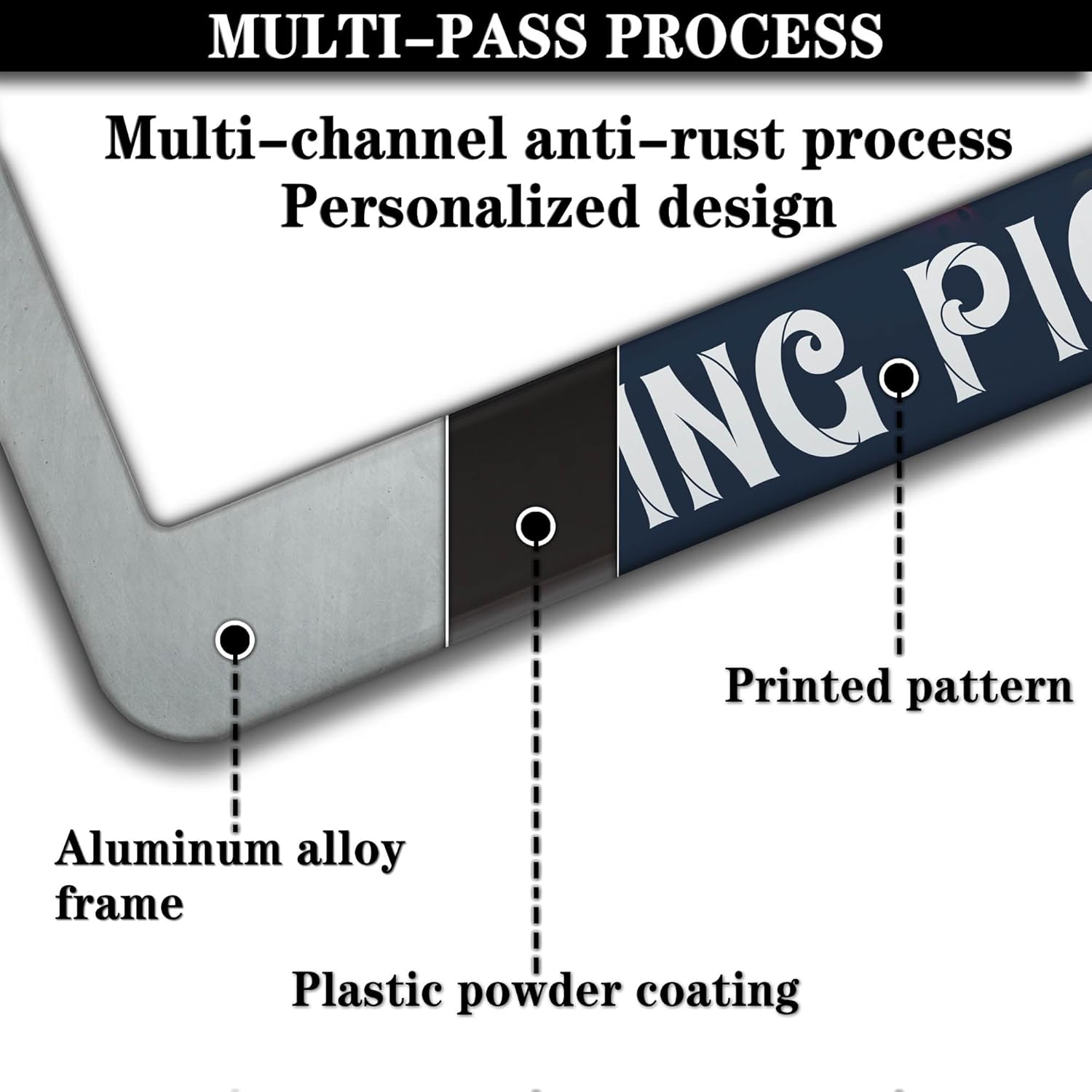 - ALUMINUM FRAME: This License Plate Frame is crafted from high-quality aluminum that is resistant to corrosion, rust, and harsh weather conditions. Its rugged reliability design ensures a long lifespan, making it capable of withstanding car washes and extreme weather, providing you with a reliable and stylish solution for your vehicle.