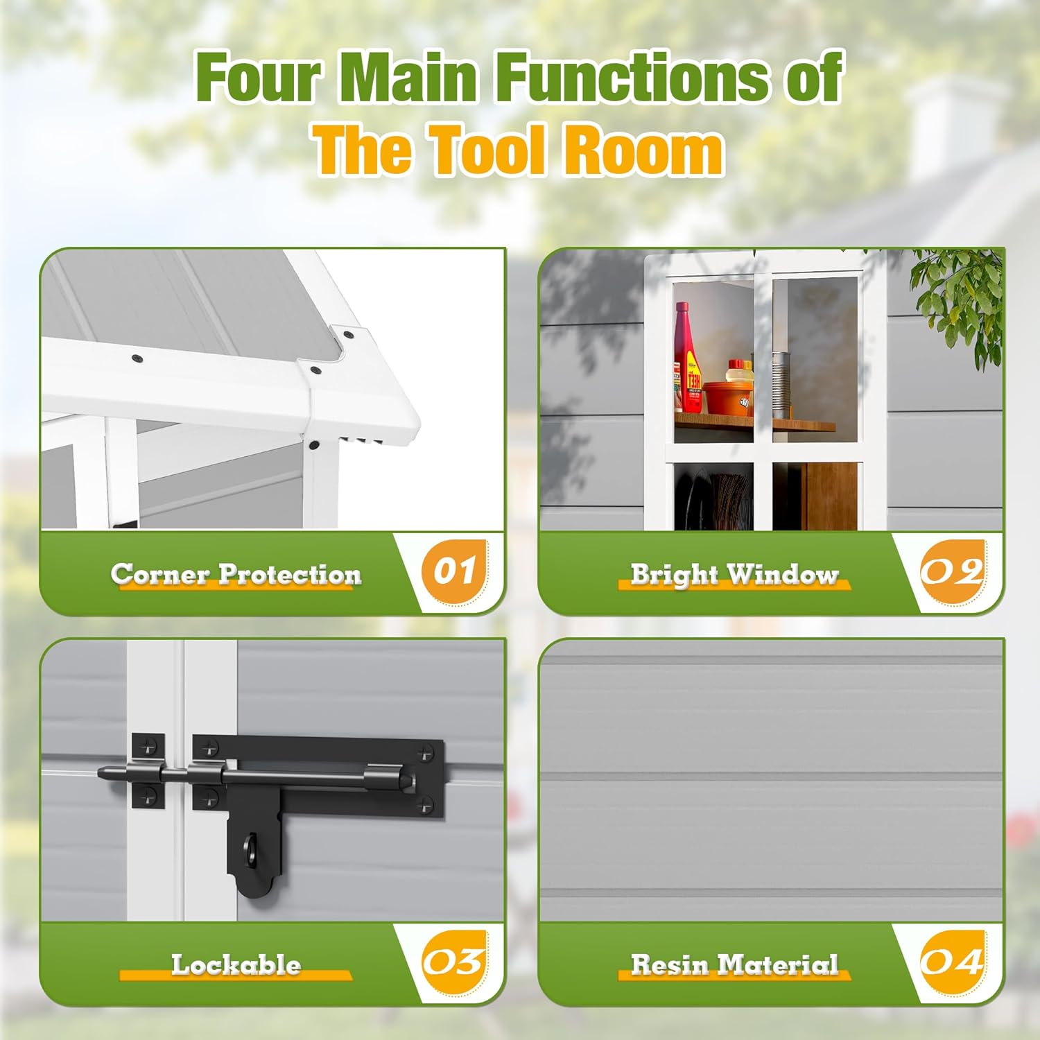- SPACIOUS 6'X4' RESIN SHED: Greesum outdoor shed is available in two sizes to meet your storage space needs. It can store items you don't need for a while, such as bicycles, garden tools, toys, so that you can reap the benefits of a tidy and bright yard; it can also be used as a pet shed.