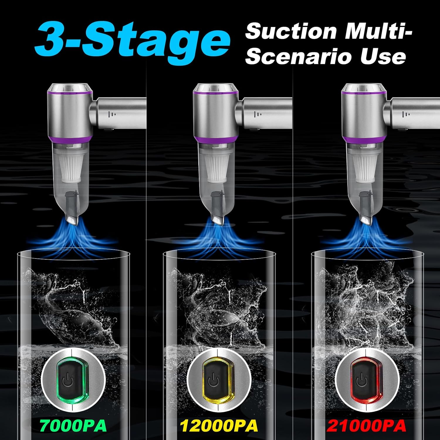 - ăHigh-power Brushless Car Vacuum CleanerăOur car vacuum portable cordless is equipped with an upgraded high-efficiency brushless motor, with an output of 100W and a rotation speed of 210000rpm, which has strong performance. Moreover, this Mini Vacuum Cleaner also has three adjustable suction modes of 9000PA, 15000PA and 20000 PA to meet your different cleaning needs and provide you with a dynamic and efficient use experience.