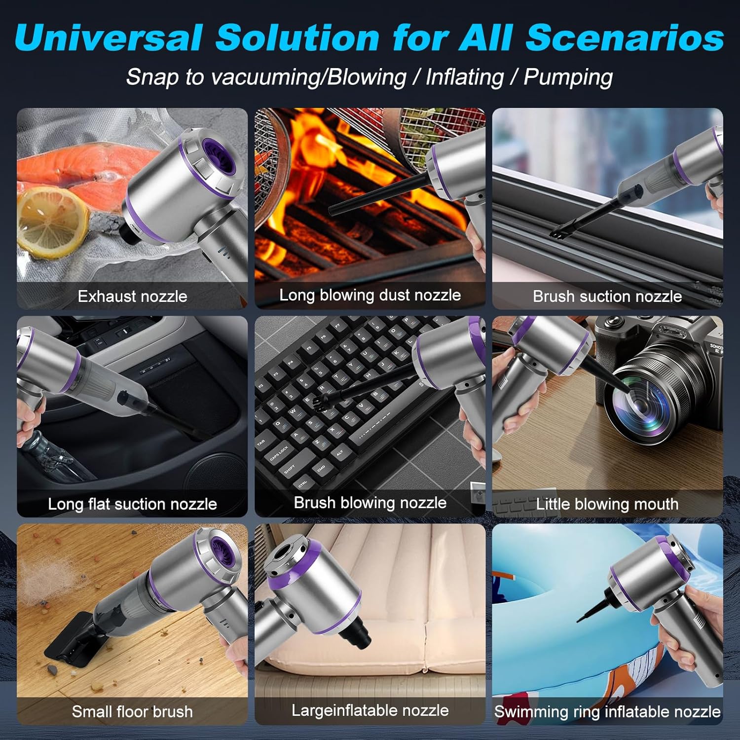 - ăRich multifunctional accessoriesăOur handheld vacuum provides a variety of accessories to meet all your needs, such as long nozzles, brushes and long nozzles, which can easily clean all kinds of dust and garbage. Blower nozzle provides strong airflow, which can quickly dry wet clothes or hair. Suction nozzles can suction and inflate organizers to make organizing easier. Pet care brush can suck away hair while brushing your pet. Inflatable nozzles can inflate balloons, swimming rings and so on