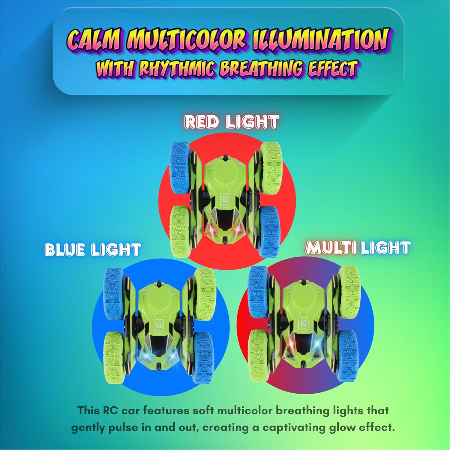 All-Round Drive Stunt RC Car - 360ยฐ Spins, High-Speed Off-Road with LED Headlights, 2 Rechargeable Batteries, AAA Remote Batteries, All-Terrain for Kids 6+ & Adults (Green & Blue)