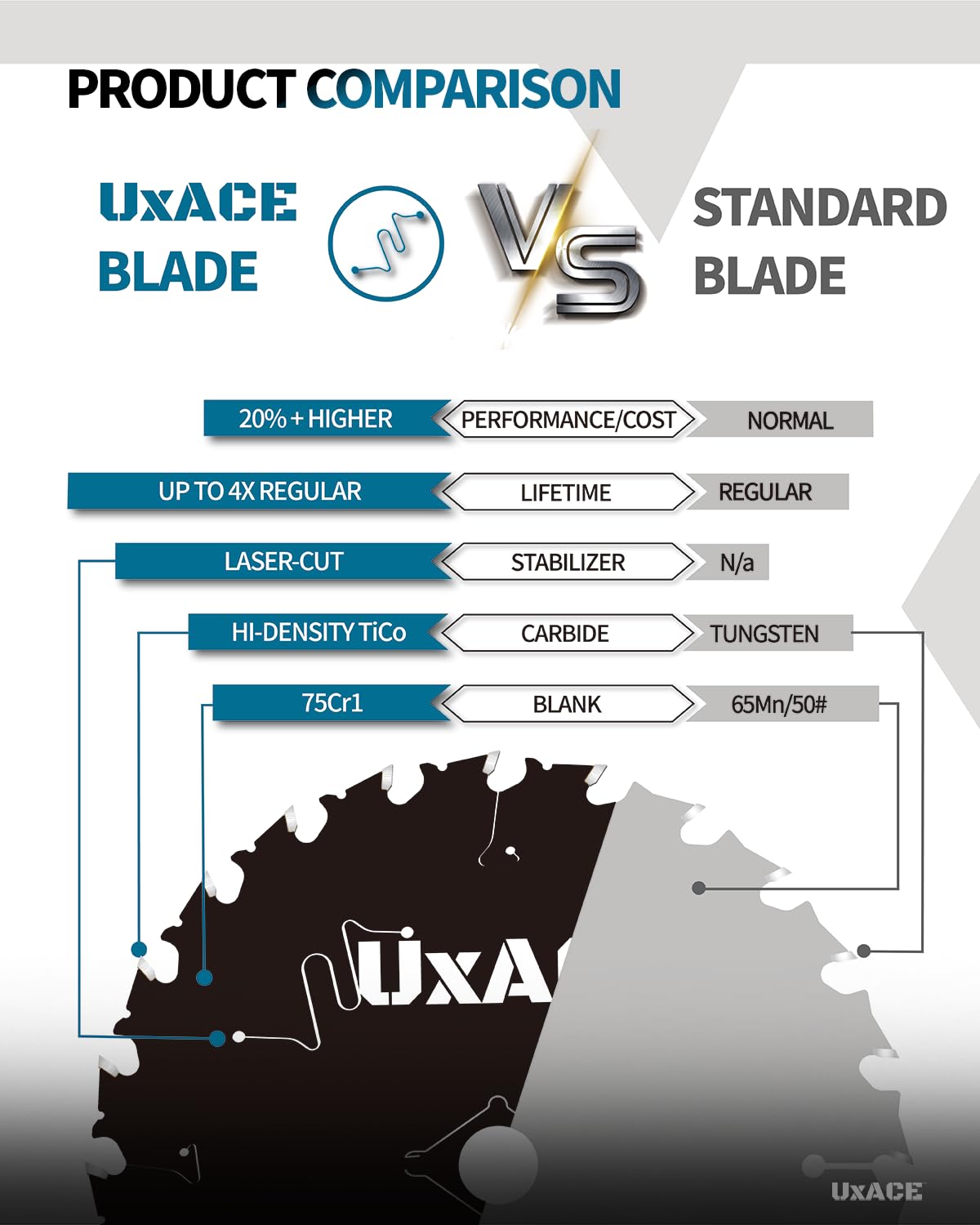 - 【WIDE RANGE OF APPLICATION】UXACE professional wood cutting circular saw blade delivers extraordinary performance and maximum lifespan. With thin kerf design, hi-density TiCo carbide and 75Cr1 hardened steel body manufactured, this is the blade suitable for anyone looking for smooth and clean cutting experience on softwood, hardwood, plywood, pressure treated wood, MDF, OSB, lumber and laminated using a corded or cordless circular saw