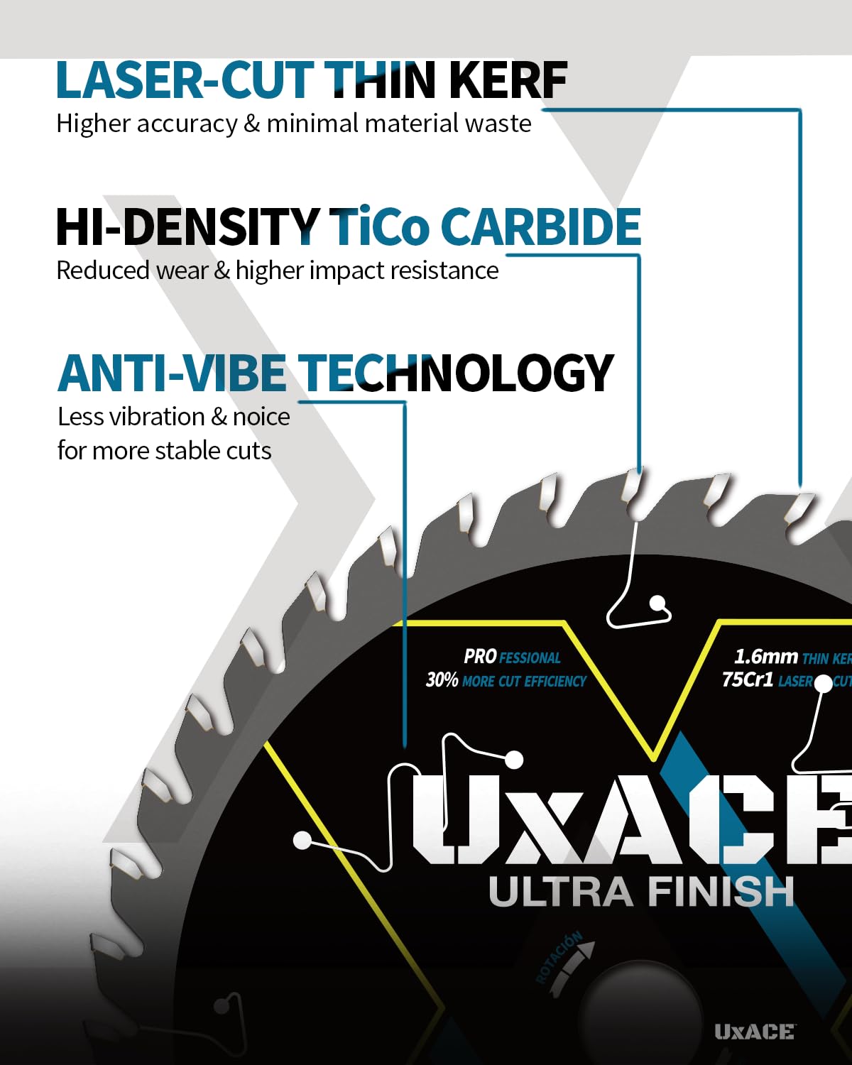 - 【WIDE RANGE OF APPLICATION】UXACE professional wood cutting circular saw blade delivers extraordinary performance and maximum lifespan. With thin kerf design, hi-density TiCo carbide and 75Cr1 hardened steel body manufactured, this is the blade suitable for anyone looking for smooth and clean cutting experience on softwood, hardwood, plywood, pressure treated wood, MDF, OSB, lumber and laminated using a corded or cordless circular saw