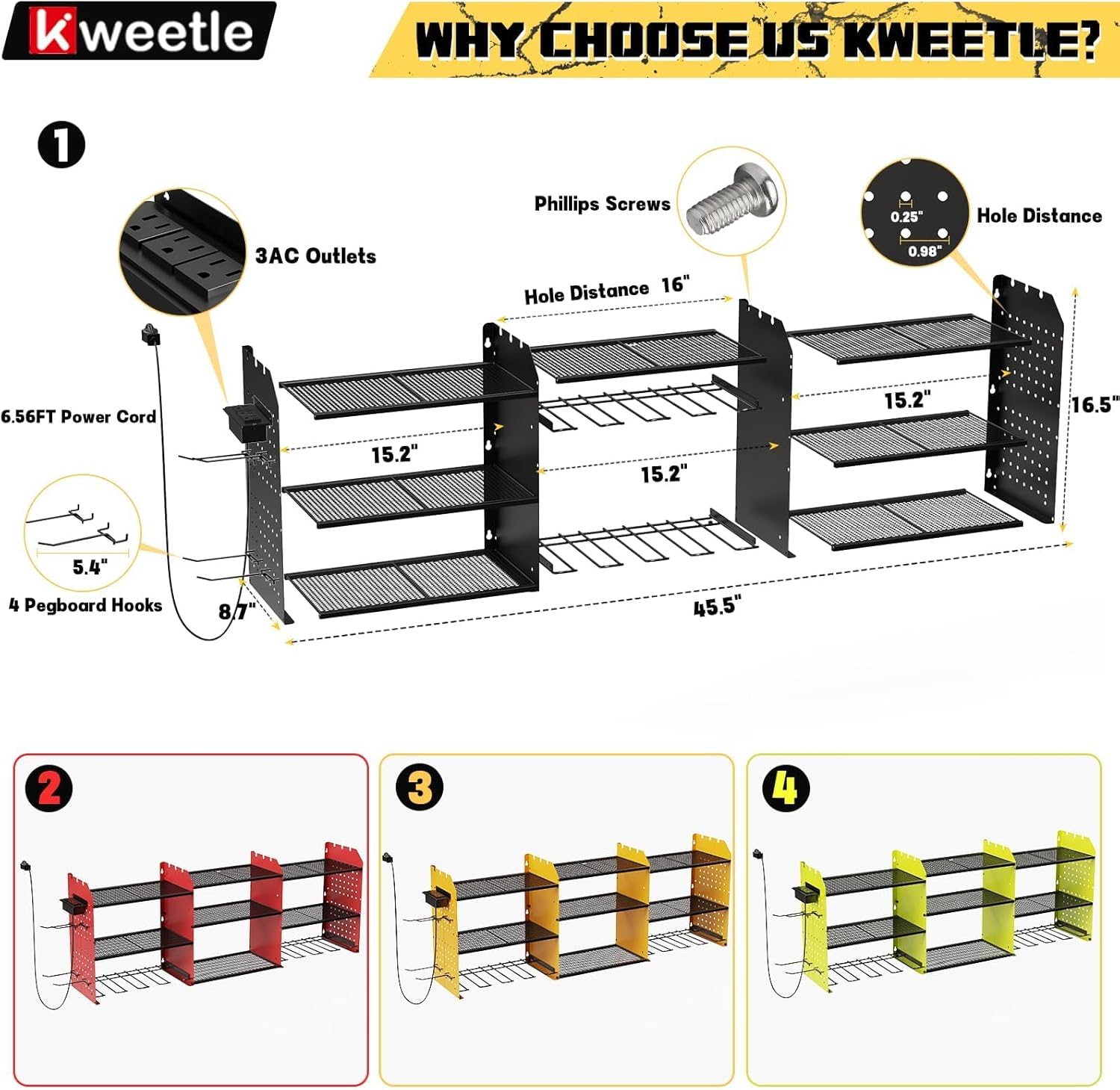 - 【HIGHLIGHT DESIGN】The user-friendly 3-plug and a plug-in row with 3 jacks are designed to be flexibly mounted on the left or right side of the shelf depending on your actual usage habits and workspace layout. Its output power of 125V/12A/1500W is like a stable and powerful energy source, which provides reliable power support for your equipment. Additionally, we've equipped you with a 6.56-FT power cord that continuously powers the tool rack