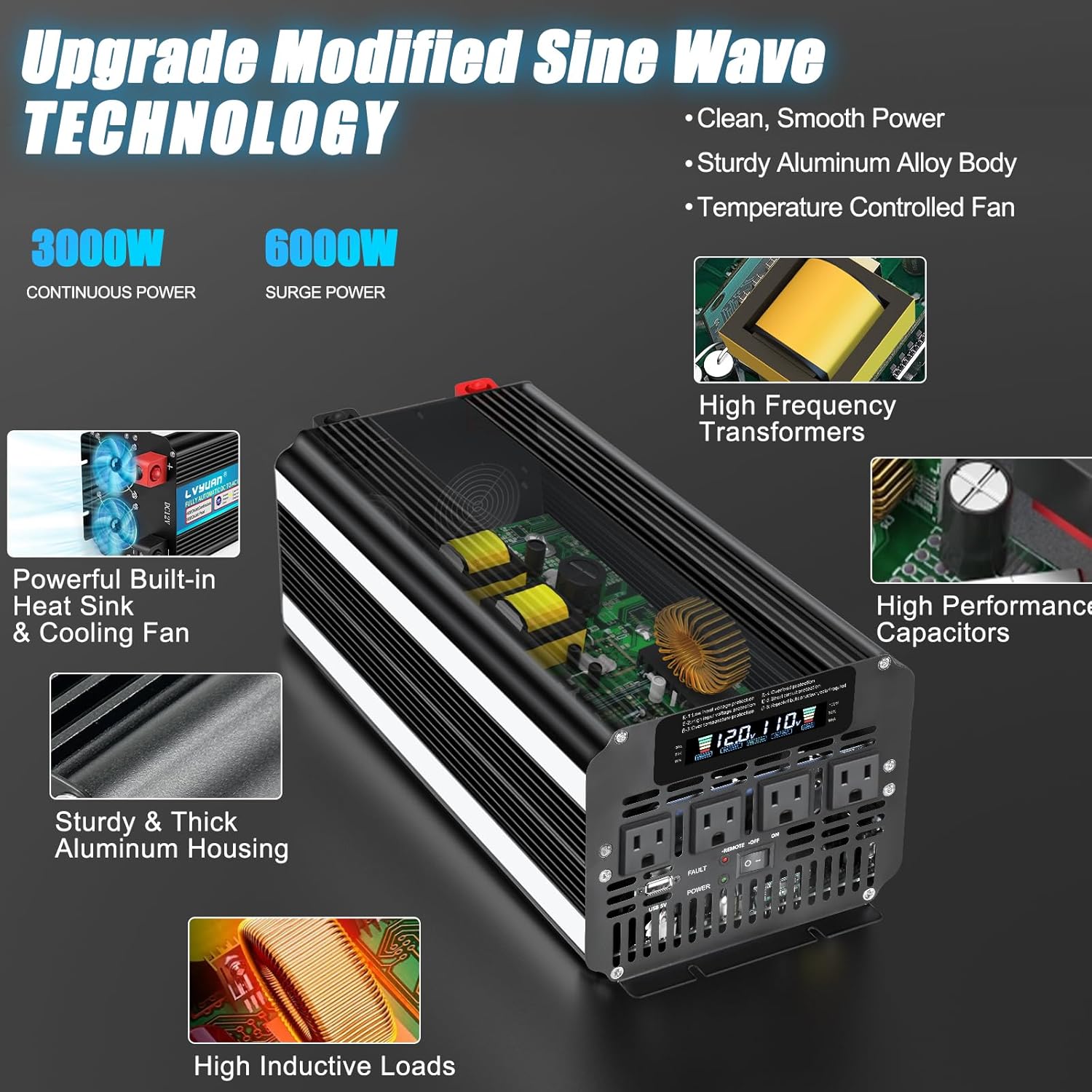 - 【3000W High Power Output-Heavy Duty Inverter】This powerinverter 3000 watt converts 12V DC to 110V / 120V AC, delivering 3000W continuous and 6000W peak. ldeal for RVs, solar inverter systems, and power inverters for vehicles with high load needs