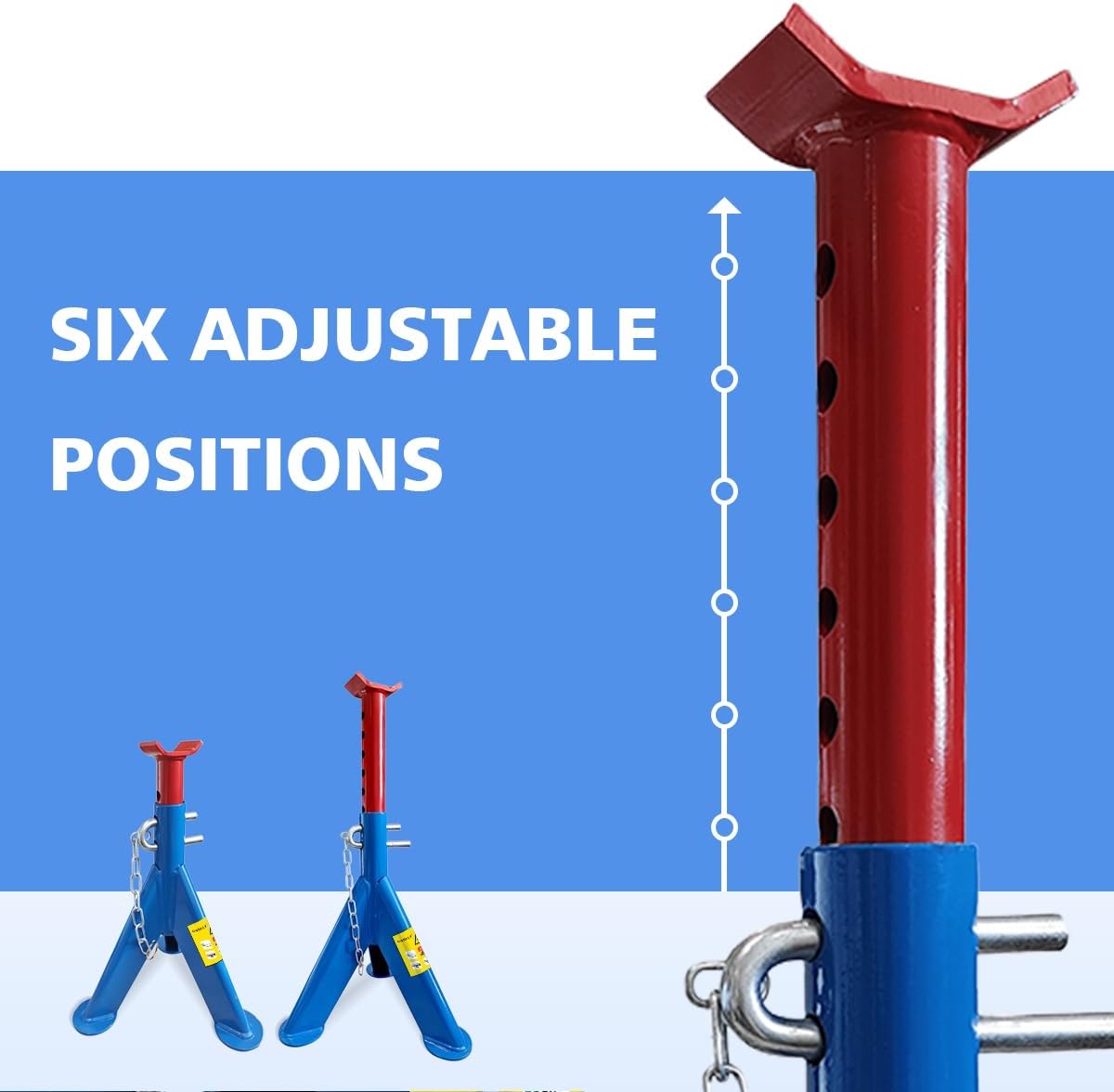 - Our car jack stand is equipped with a mobility pin height adjustment mechanism that offers 6 adjustable positions, delivering flexibility and added security for all your lifting needs.